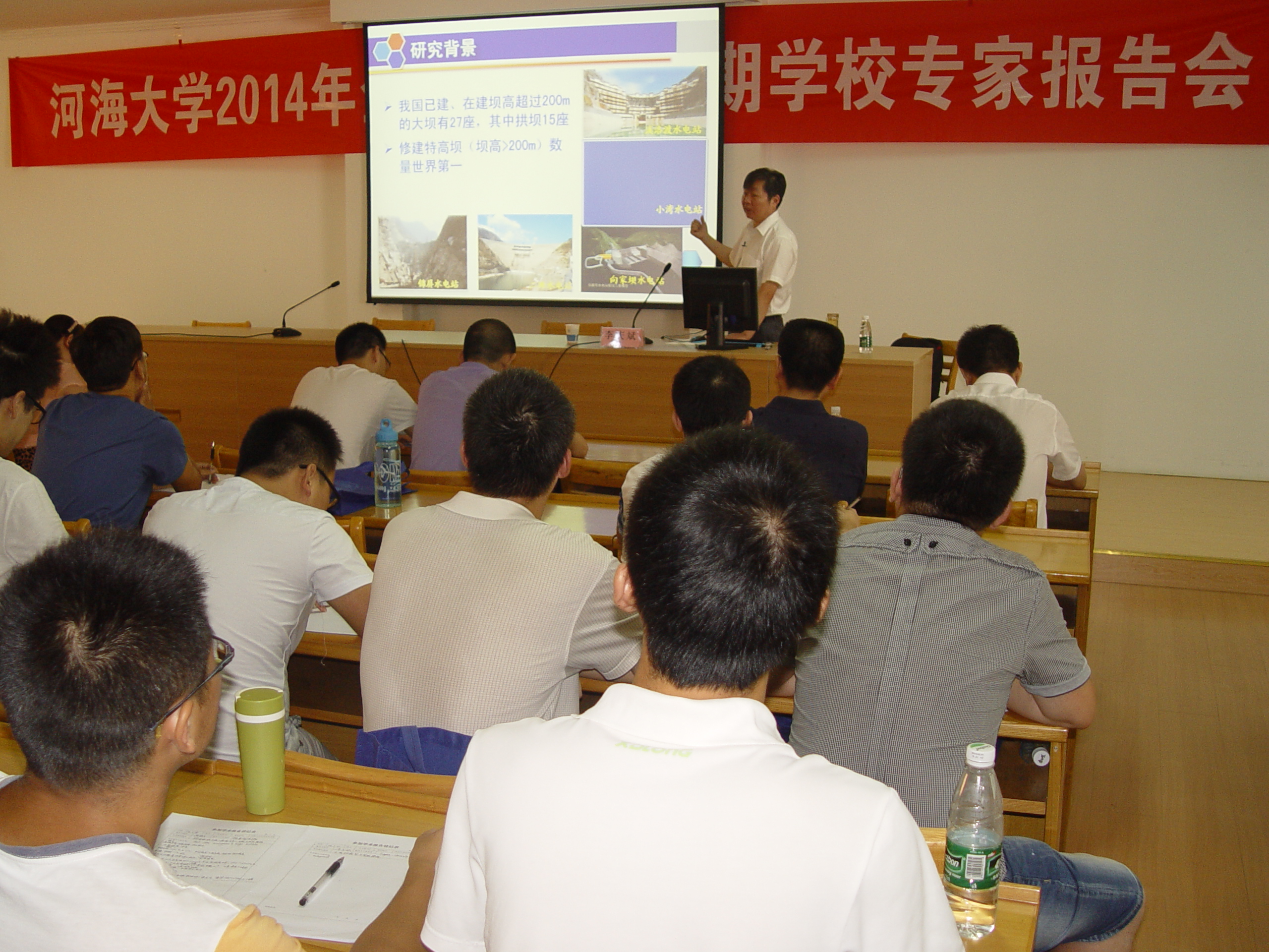 李庆斌教授首先向学员们介绍了高坝由于库岸滑坡、坝体严重裂缝、施工期围堰漫水、泄水建筑物空蚀破坏、防渗帷幕设计失误、消力池冲刷破坏的原因造成安全事故的案例。进而提出高坝施工期、运行期和抗震的三大挑战,面对挑战存在材料尺寸、材料——结构系统力学联合、设计仿真真实协同三方面存在的不足,以及裂缝研究的尺寸和耦合两方面存在的瓶颈。接着他提出一些关键问题,并针对施工期裂缝的控制,提出即时性能的概念。最后李教授应用其参与的溪洛渡电站智能通水系统的设计,展示了智能温度控制方面其已经研发的成果和申报的专利。李教授展望未来大坝研究的趋势,提出数字大坝向会向智能大坝转变。会后同学们向李教授积极探讨裂缝控制方面的问题,李教授的科研魅力感染了在场的每一位学员。