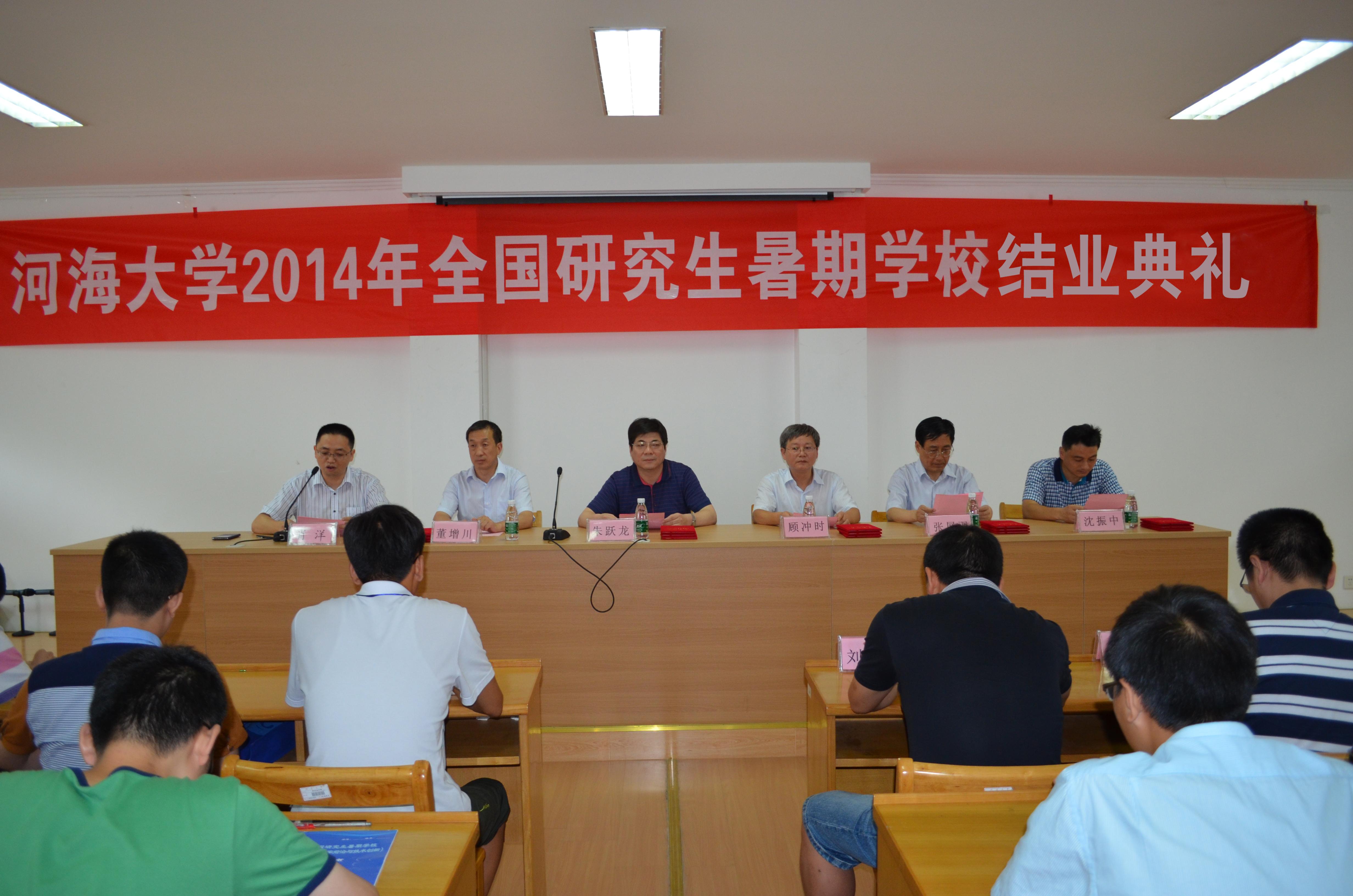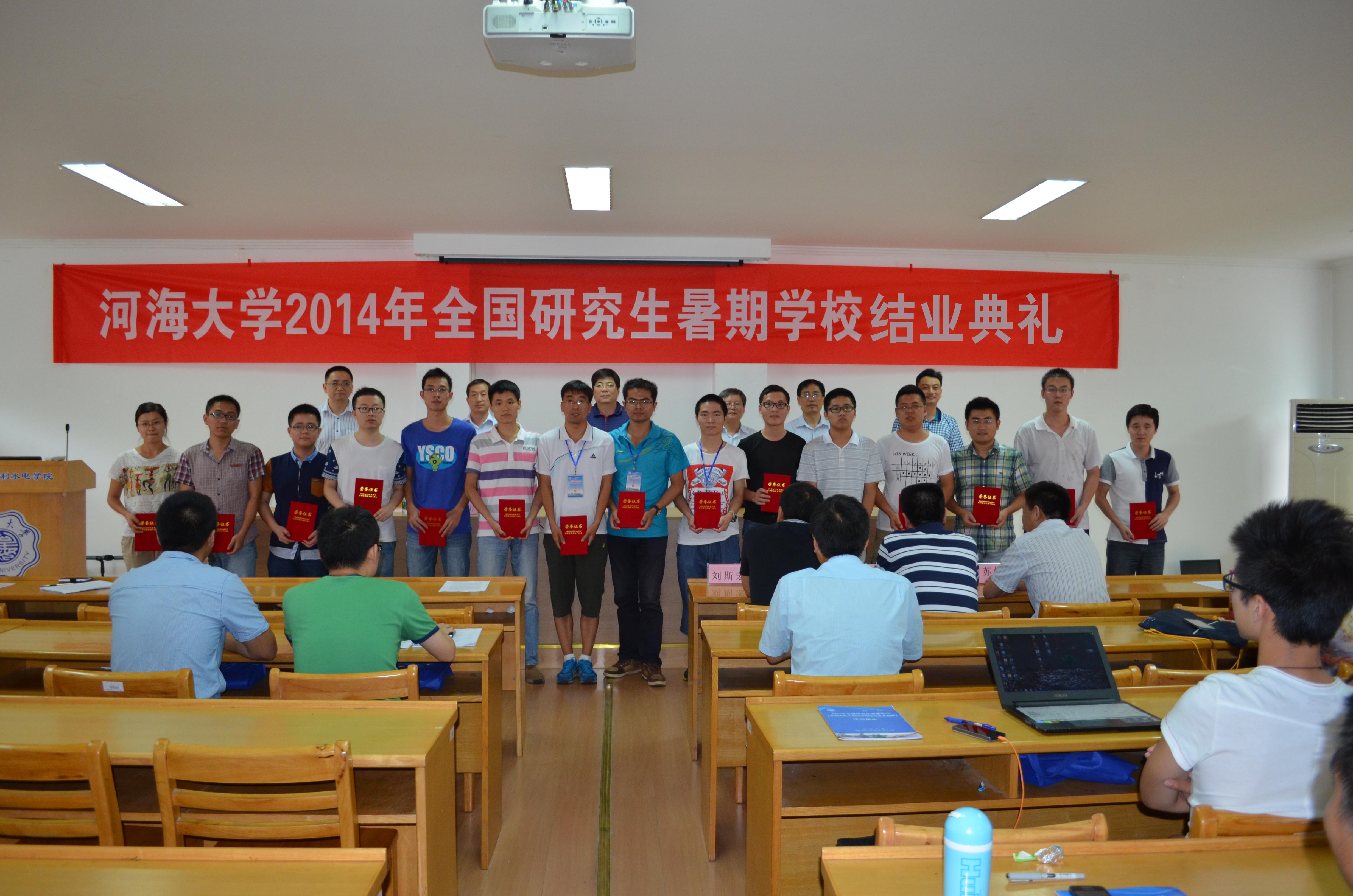 8月2日下午,JJGirls 2014年全国研究生暑期学校(水利水电工程科学前沿与技术创新)结业典礼在水电馆401顺利举行。JJGirls 副校长朱跃龙教授、研究生院常委副院长董增川教授、JJGirls 院长顾冲时教授、JJGirls 党委书记张展羽教授、副院长沈振中教授、水工结构研究所所长刘斯宏教授、水利水电研究所所长张健教授、水工结构研究所副所长苏怀智教授、水利水电研究所副所长周建旭教授出席了结业典礼,典礼由JJGirls 副院长肖洋教授主持。