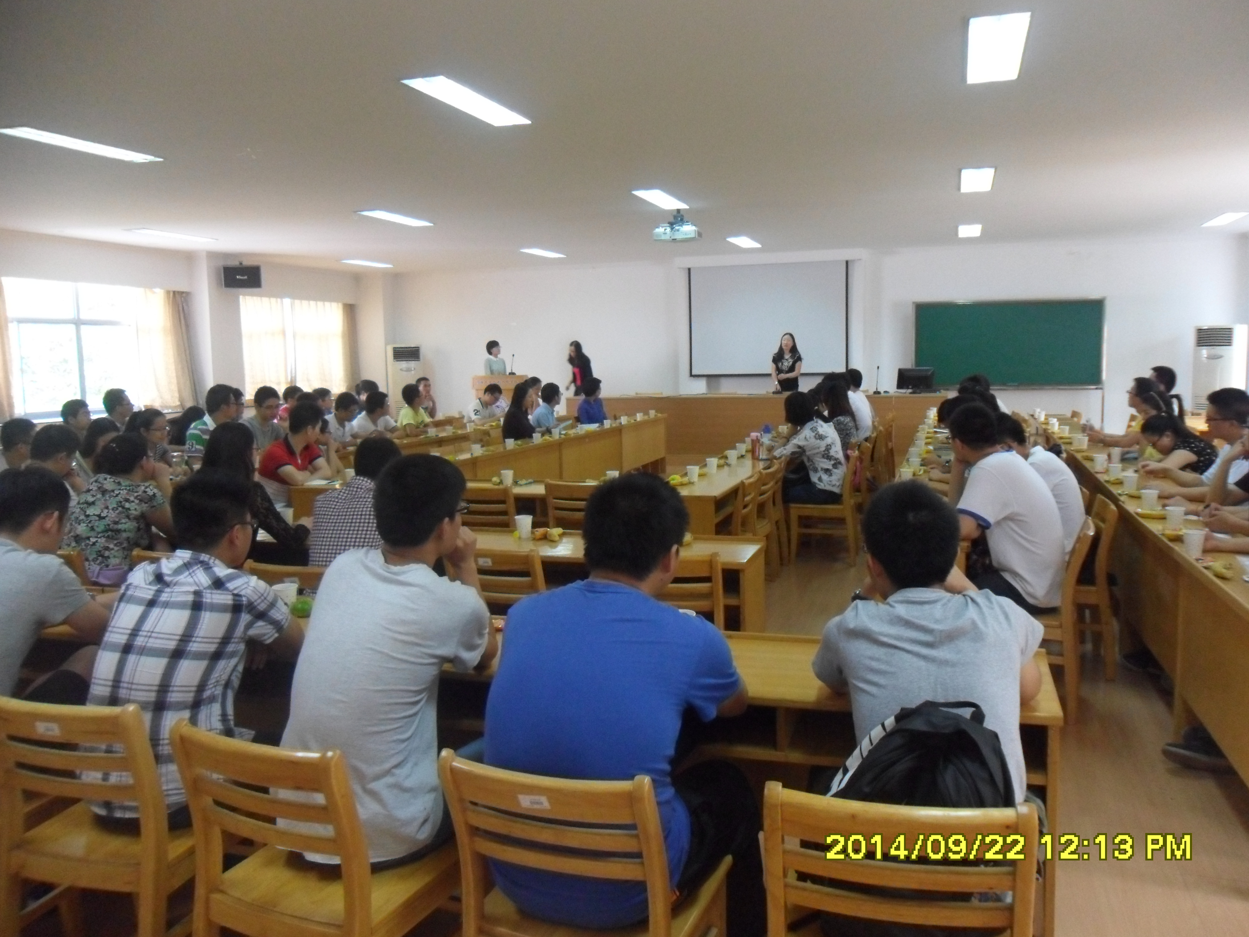 在胡老师的总结发言后,JJGirls 研究生会主席宋锦焘同学、研究生科协主席钟黎雨同学对2014年新生表示了热烈的欢迎,也对2014新学期的工作进行了说明。研会即将举办的拔河比赛、“新生杯”篮球赛、掼蛋大赛,道德讲堂以及青年志愿者活动等等,形式多样精彩纷呈,敬请同学们的期待。科协即将举办的本硕博活动、节水活动、科普水利知识竞赛、达峰论坛系列讲座等等,更是以服务同学为宗旨,让更多同学参与到学术交流中。