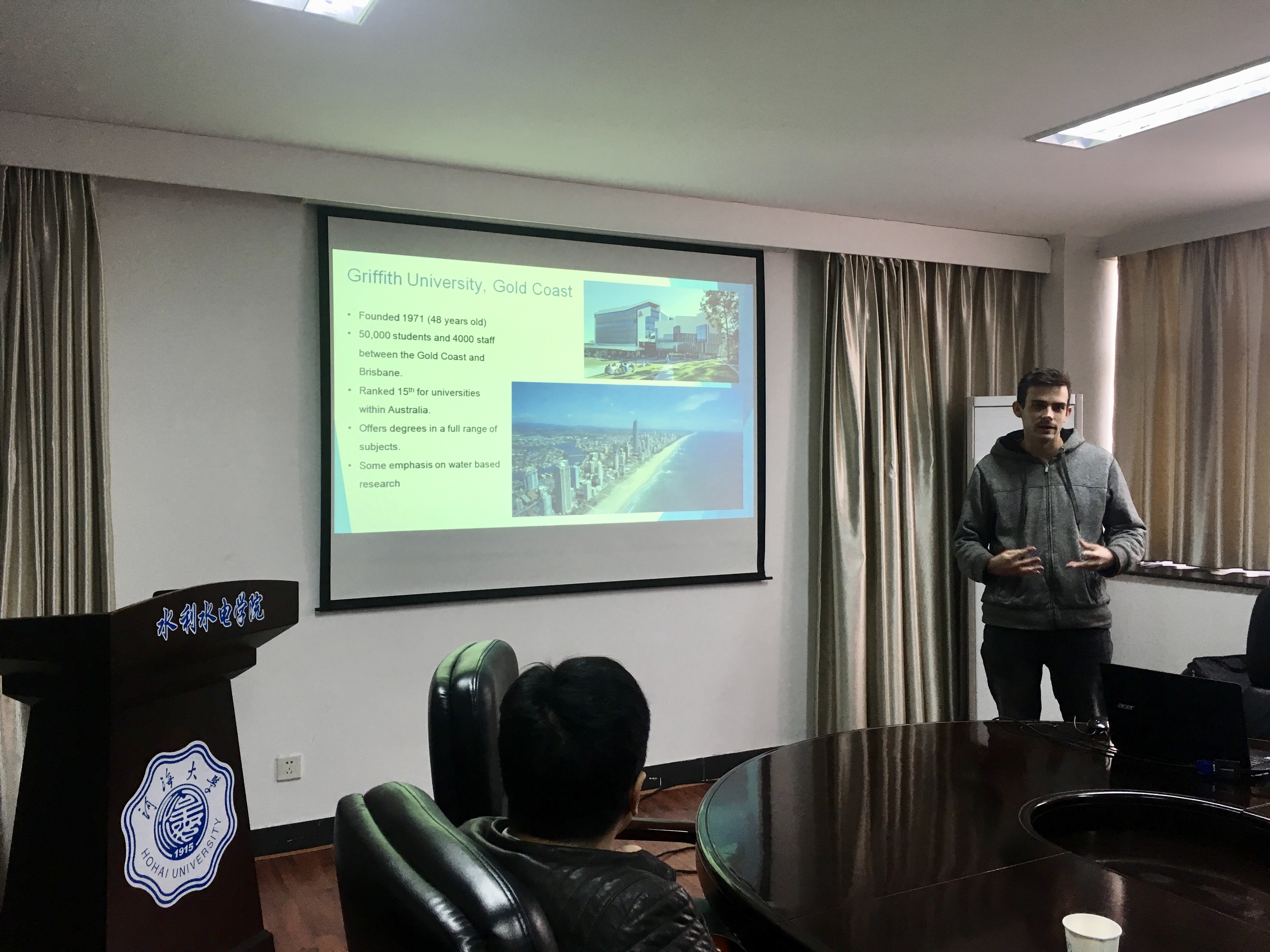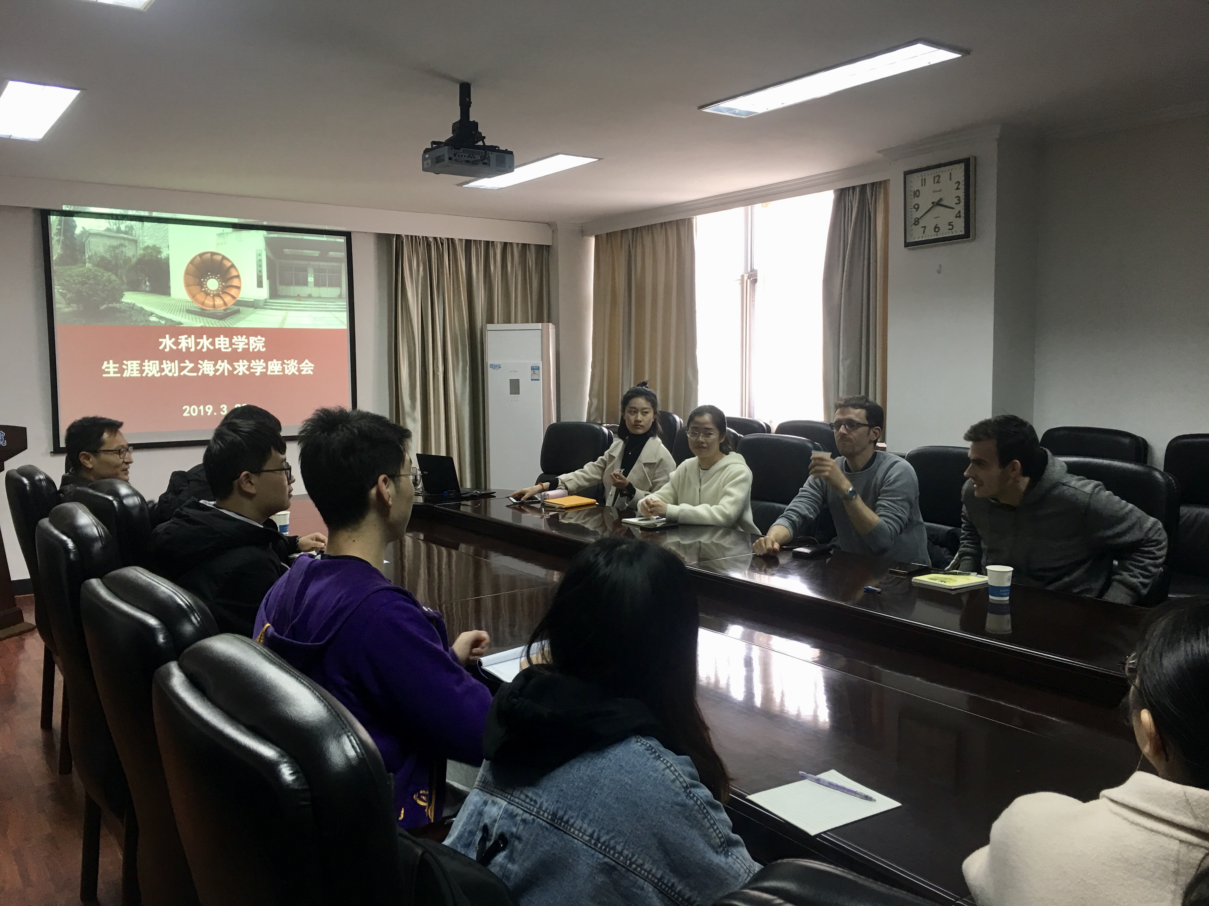 两位交流生从院校信息、专业课程设置、高新技术在水利行业的应用以及个人大学经历等方面,通过PPT、流利的英语向大家展示介绍了国外水利行业的发展现状以及丰富多彩的大学生活,让同学们充分了解海外求学的专业选择及努力方向。在座谈中,同学们也就出国留学与国外生活方面的疑问与主讲人展开全面的交流,现场气氛十分热烈。