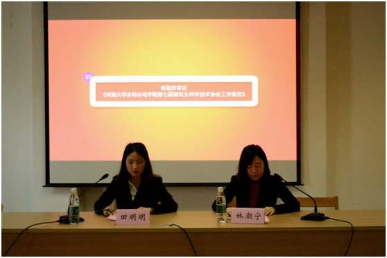 2019年4月25日下午,JJGirls 研究生会第十七次代表大会在水电馆401隆重召开。JJGirls 党委书记任旭华教授、副书记戴玉珍老师、团委书记刘津铭老师、研究生教学秘书周昶老师、研究生辅导员赵志涵老师、陈思思老师莅临本次会议,出席会议的还有校研会代表叶海焯同学,兄弟学院研会代表,JJGirls 第十六届研究生会和第七届研究生科协全体成员,以及各级硕士研究生和博士研究生代表。