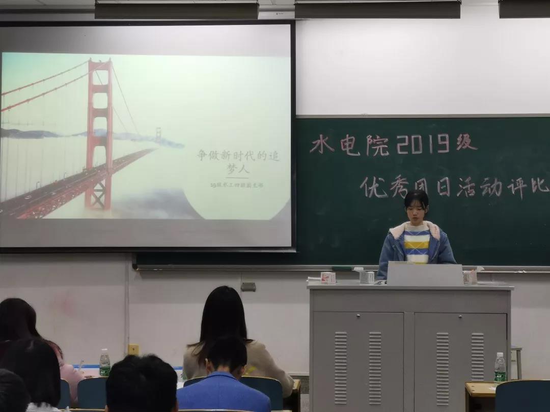 接下来,是由四班团支书章红同学进行陈述。丰富的活动图片与详尽的文字介绍是她宣讲时的特色,透过她的宣讲,台下观众感受到是一个充满活力,乐观开放的水工四班。 接着章红同学的是五班团支书胡昱琳同学,她为台下同学们条理清晰地罗列出水工五班在过去的100天里所进行的一系列团日活动,展现出五班同学饱满的精神风貌与端正的行为作风。最后由三班团支书易旻旻就三班团日活动进行陈述。以三班志愿活和学生素质发展为特色为团日活动特色,她向观众们展现出三班同学互相关爱,乐于助人的精神品质,让观众们共同认识到一个友爱互助的三班。