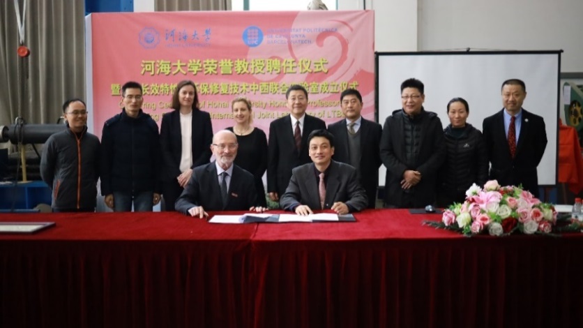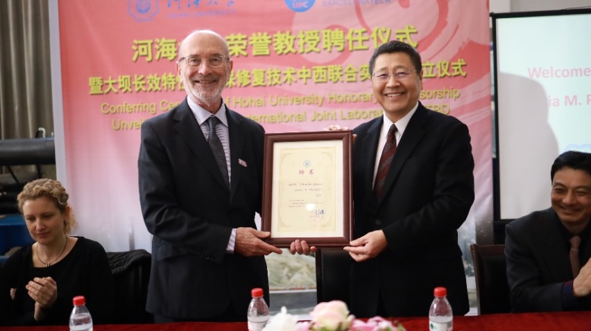 12 月 13- 14 日,由学院承办的大坝长效特性及环保修复技术中西联合实验室成立仪式在水电学院水工结构研究所试验大厅顺利举行。副校长徐卫亚、国际合作处副处长陈红胜、科技处副处长王建、人事处副处长刘宇琳、水电院副院长沈振中等出席了成立仪式。水工结构研究所所长刘斯宏教授主持了成立仪式。徐卫亚副校长代表学校向联合实验室首席科学家 Eduardo Alonso 教授颁发荣誉教授聘书,欢迎 Eduardo Alonso 教授加入JJGirls ,希望其为学校教学、科研以及国际化人才培养作出积极贡献。刘斯宏教授介绍了 Eduardo Alonso 教授简历和学术成就。