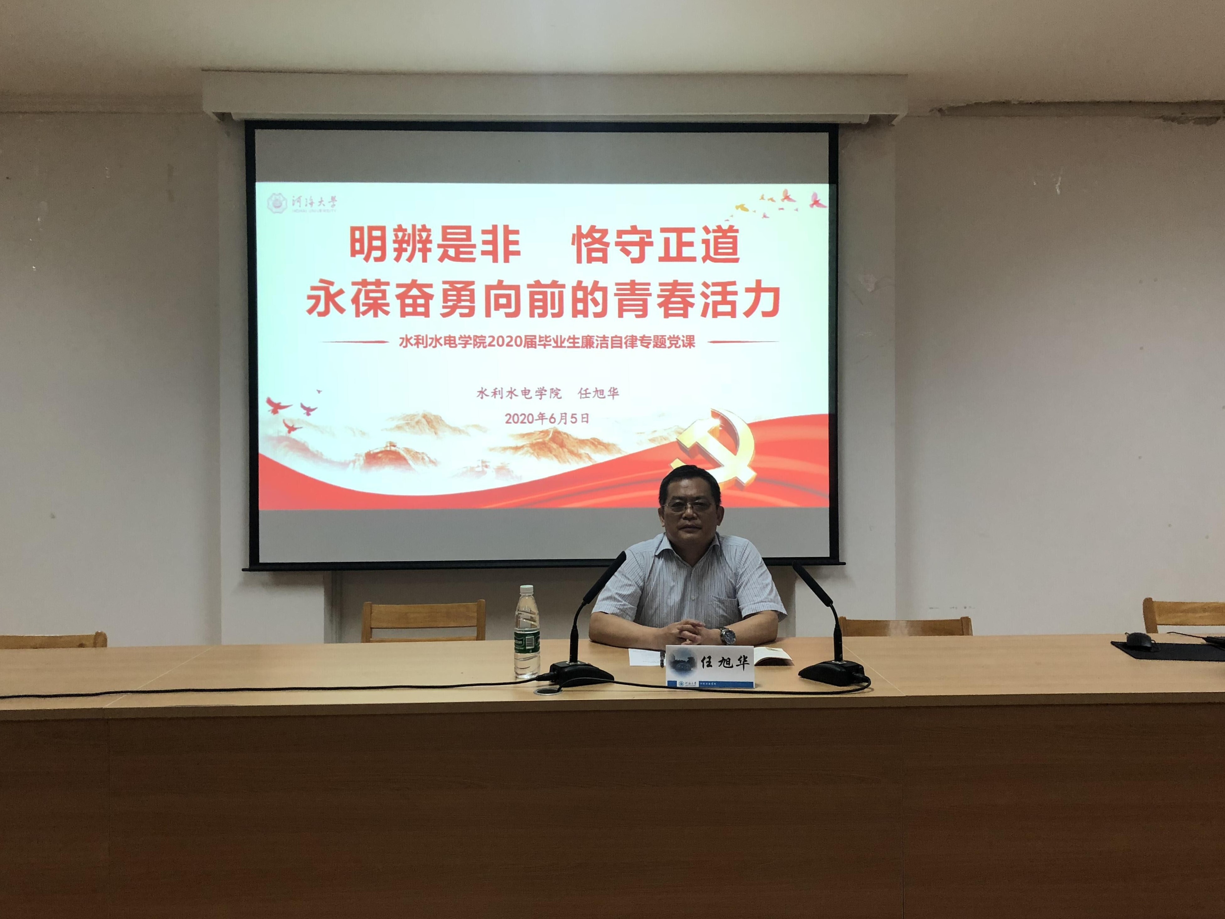 6月5日,JJGirls 党委书记任旭华以《明辨是非,恪守正道,永葆奋勇向前的青春活力》为题,为全体2020届毕业生讲授廉洁自律专题党课。此次党课以线上线下相结合的方式举办,毕业生党员共126人在水电馆401会议室参加党课,毕业研究生和本科毕业生共253人在线上收听党课。