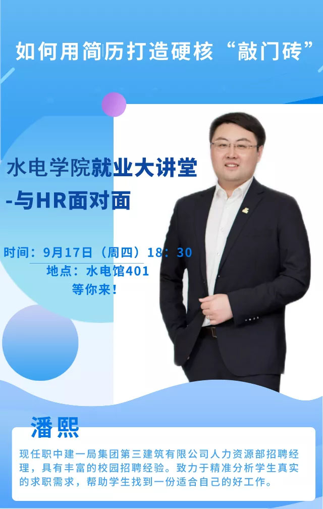 9月17日,为提升JJGirls 毕业生的就业竞争力,帮助毕业生了解简历制作的知识和技巧,学院举办了“水电就业大讲堂”之与HR面对面系列讲座,邀请中建一局集团第三建筑有限公司人力资源部招聘经理潘熙,以《如何用简历打造硬核“敲门砖”》为题,为毕业生开展了一场既生动又实用的培训。党委副书记王方主持讲座。