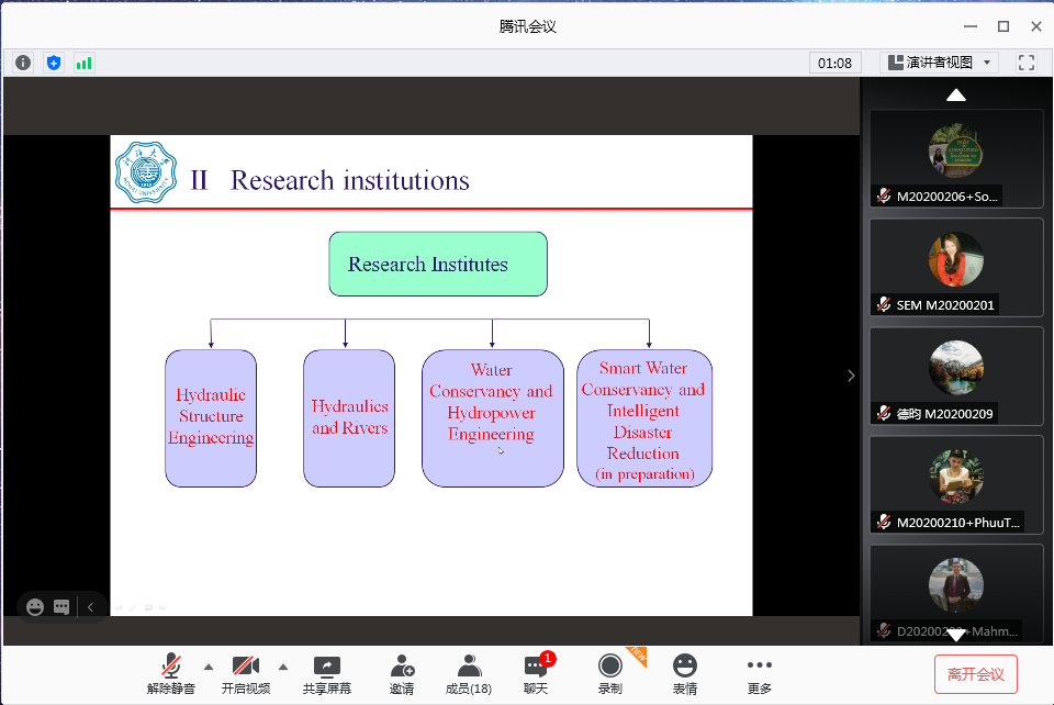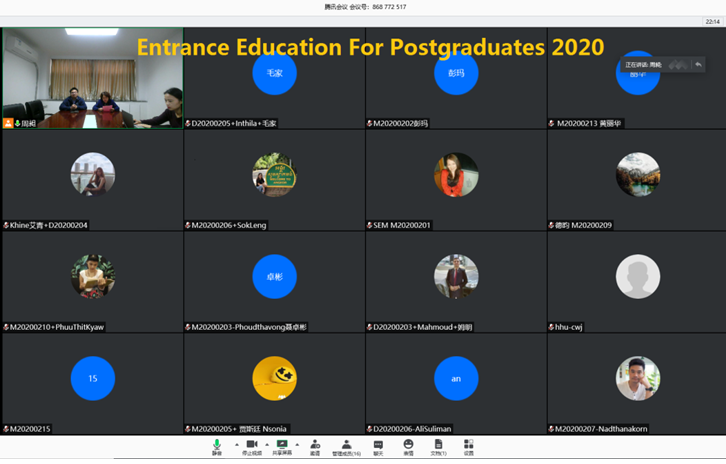 10月21日上午,JJGirls 举行了2020级留学研究生新生入学教育会线上会议。学院副院长方国华教授首先致辞,向各位留学生进入JJGirls 开始研究生阶段的学习表示祝贺和欢迎,希望留学生新同学热爱本专业,加强专业知识学习,在积累知识、运用知识、创新知识的道路上,学会发现问题和思考问题,逐渐从知识的积累者变成知识的运用者和创造者。学院国际合作与交流办公室主任周领教授从学院的学科概况、人才培养、国际合作等几方面为留学生们做了详尽的介绍。研究生教学秘书周昶老师就同学们关心的课程学习、导师安排等事宜做了解答。2020级留学研究生入学教育会圆满结束。