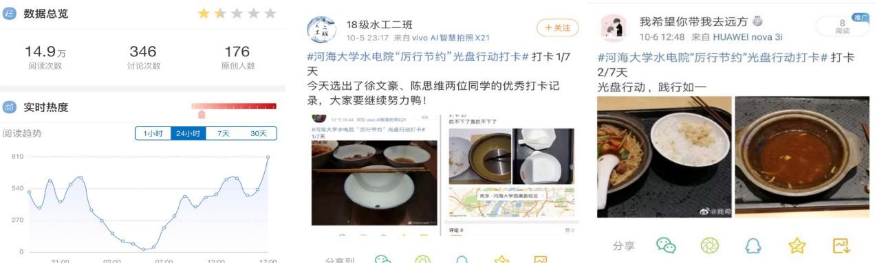 他们光盘宣誓,设计专属光盘打卡脸贴,拒绝“舌尖上的浪费”,呼吁亲朋好友庄严宣誓,做光盘接力者、弘扬者,最终微博和易班平台话题阅读量100000+,参与讨论人数破千。他们除草护粮,走进JJGirls 节水园区,学习水稻培育知识,除草松土,感悟粮食来之不易。他们旧物传爱,收集全校同学衣物、塑料瓶、纸箱等可回收物品,联系“噢啦”环保公益回收平台进行捐赠,做节约暖心者。他们光盘作画,开展“观我画中意,知我节俭心”光盘艺术家大赛,开拓节约活动中的美育新格局。他们视频传愿,录制Bilibili公益宣传片,自编自排、自导自演,呼唤更多青年勤俭节约的青春力量……