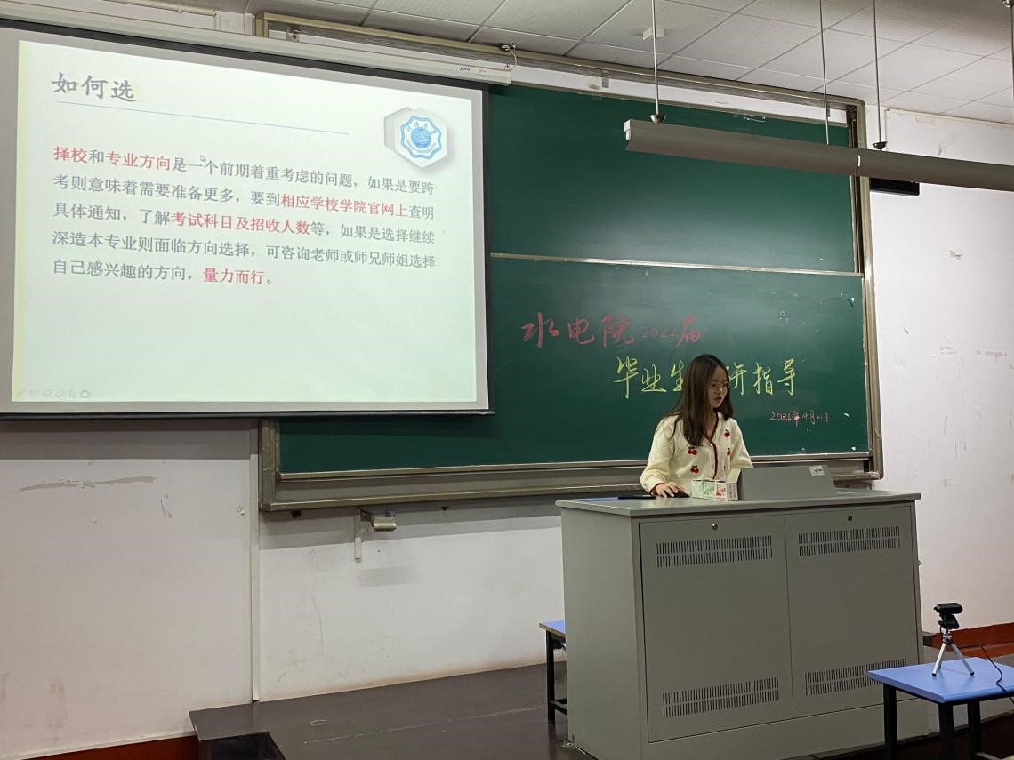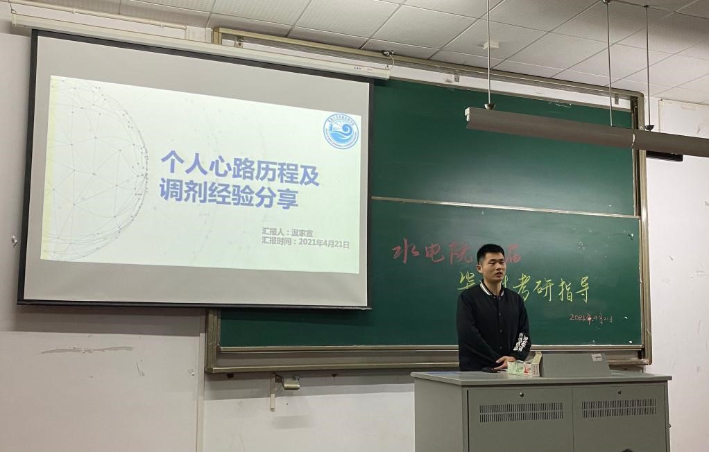 2017级的四位学长姐分别进行考研和调剂的经验交流。以416分高分被我校土木水利专硕录取的刘雪娇分享了自己在考研过程中选择的学习课程、学习资料和学习方法,同时对学硕和专硕考试科目进行了横向对比,帮助同学们提高复习效率,并根据自己的亲身经历给出相应的学习建议,树立了良好的学习榜样。