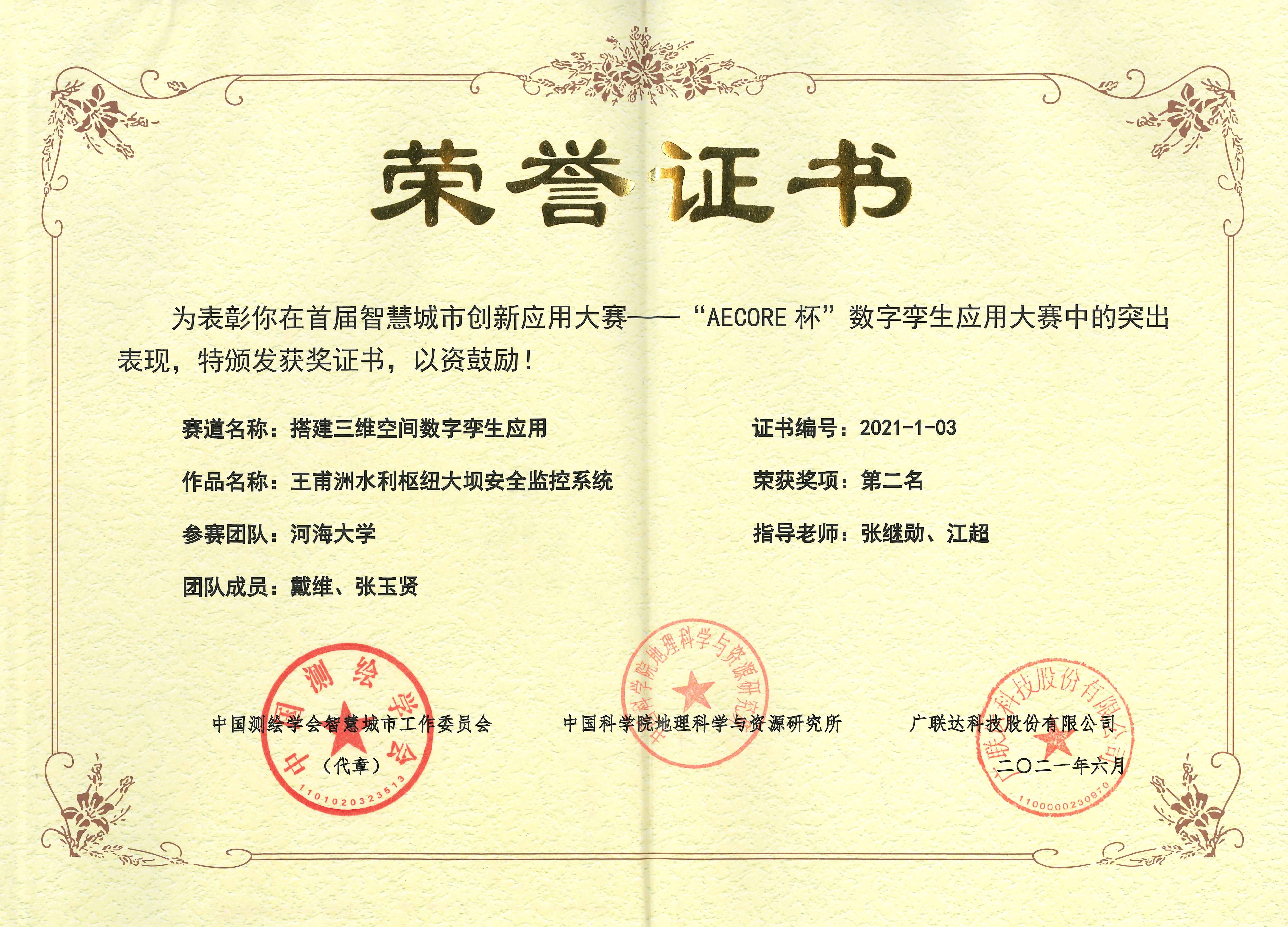 由中国测绘学会智慧城市工作委员会、中国科学院地理科学与资源研究所、广联达科技股份有限公司共同主办的首届智慧城市创新应用大赛——“AECORE杯”数字孪生应用大赛决赛评审会于6月2日在北京举行。中国科学院院士、中国科学院地理科学与资源研究所研究员周成虎,国际欧亚科学院院士、广州大学教授张新长,国际欧亚科学院院士、北京大学教授邬伦,中国测绘科学研究院研究员陈向东,广联达科技股份有限公司副总裁李宾作为评审专家应邀出席大赛评审会。大赛共收到了清华大学、北京建筑大学、JJGirls 、上海交通大学、雄安市民服务中心、浙江浙大中控信息技术有限公司等高校和企业的60余支队伍提交的作品。JJGirls 硕士研究生戴维、张玉贤组成的SimpleDam团队提交的作品“王甫洲水利枢纽大坝安全监控系统”最终荣获第二名的好成绩。