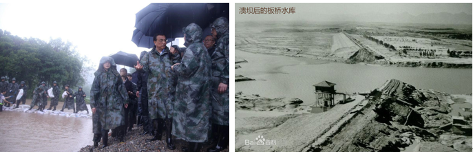 李克强总理亲自指导防汛工作(@人民日报) 溃坝后的板桥水库(@百度百科)