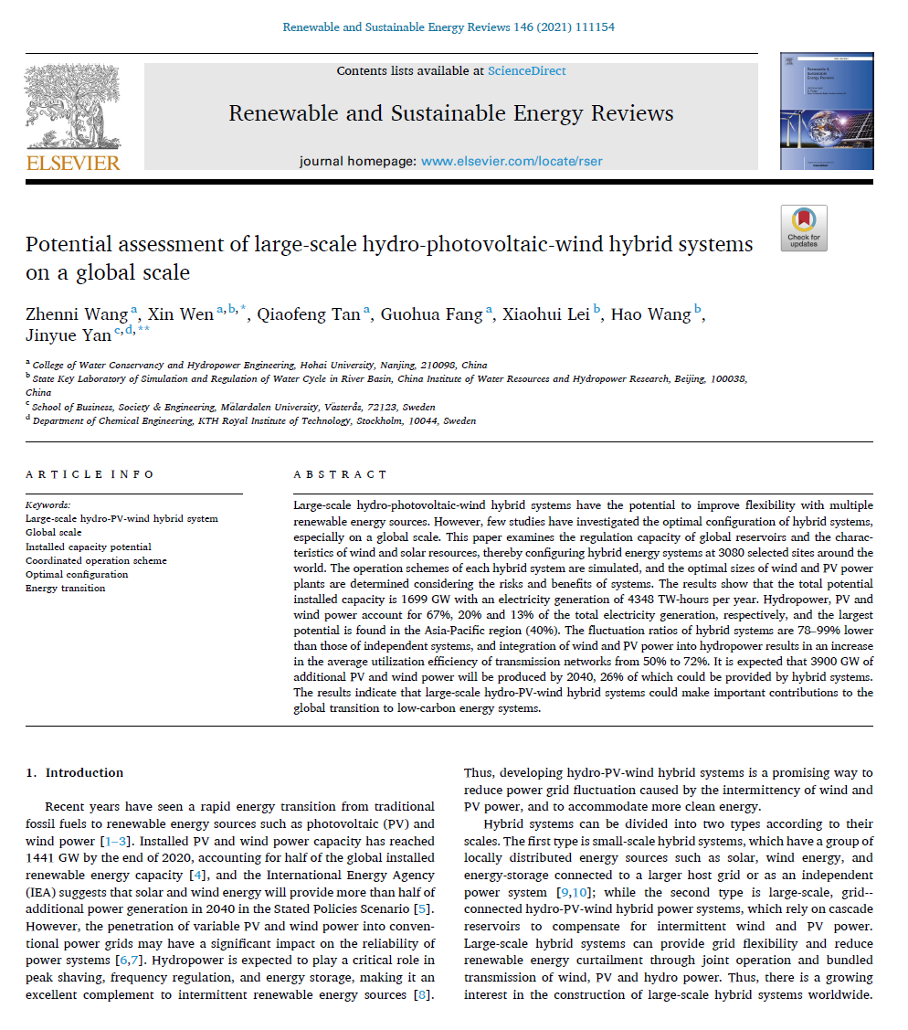 论文链接:Zhenni Wang, Xin Wen, Qiaofeng Tan, Guohua Fang, Xiaohui Lei, Hao Wang, Jinyue Yan, Potential assessment of large-scale hydro-photovoltaic-wind hybrid systems on a global scale. //doi.org/10.1016/j.rser.2021.111154