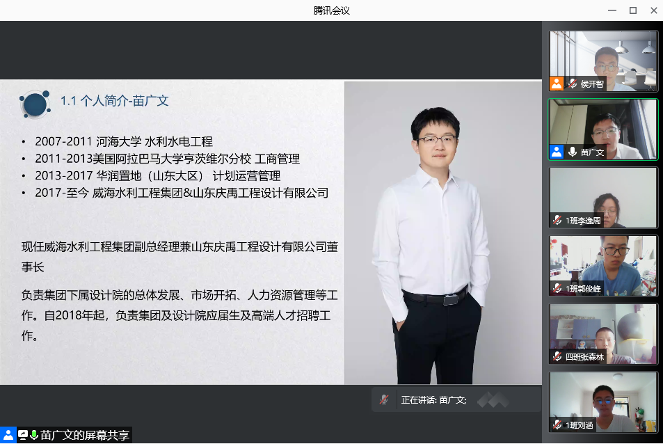 校友于良首先从全国能源电力结构体系上宏观介绍水电行业,展望水工专业未来发展前景。其次,于良从用人单位人才需求角度,用案例方式引导新生从转变、融入、赋能、成长四方面准备,在大学期间充实自我。最后于良简短介绍了华东院,并表示欢迎学弟学妹来华东院实习工作。