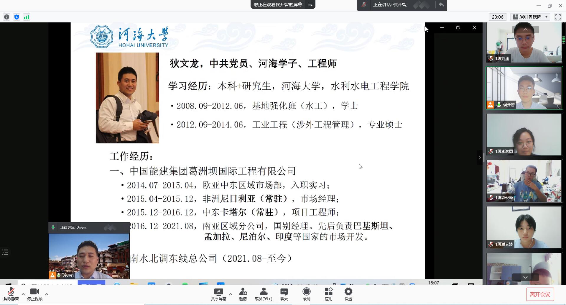 校友狄文龙从个人工作经历出发,分享参与国际工程,常驻国外岗位的工作感受。狄文龙勉励同学们要用严谨负责的态度,不怕吃苦的精神,学好专业基础。同时,狄文龙寄语新生,立足当下,放眼未来,并祝愿每一位河海学子都可以大展宏图,未来可期!