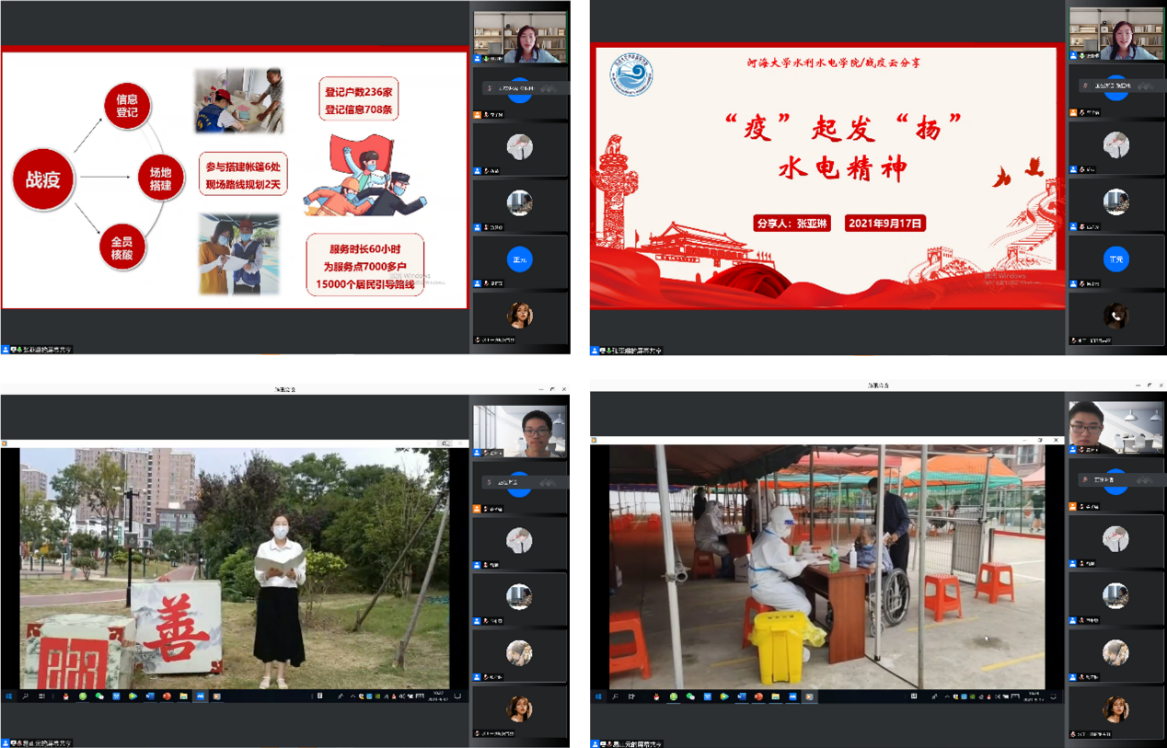 张亚琳同学讲述了在扬州高邮战“疫”经历,服务时长多达60小时,登记相关信息上百条,为服务点7000多户15000多位居民引导路线。宣讲中,张亚琳分享了自己作为一名河海水电人对抗疫精神的感悟,呼吁同学们做一些力所能及的志愿服务,对逆行者及众多甘于奉献的人心存感念。同时也提醒同学们要安排好自己的居家学习和生活,不折不扣地完成学习任务,保持优良作息,锻炼身体,为返校后的校园生活做好准备。