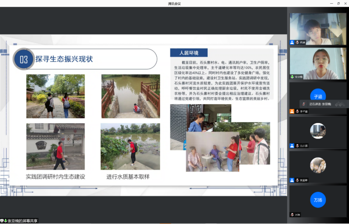 “美‘溧’乡村——石头寨“实践团为同学们介绍了溧水石头寨乡村振兴项目的实践,通过走访、座谈、问卷等形式加强对地方发展现状的了解,从旅游业、农产品再加工及营销方式等方面进行构想,并将当地居民面临的环境问题进行反馈,探索生态振兴秘钥。