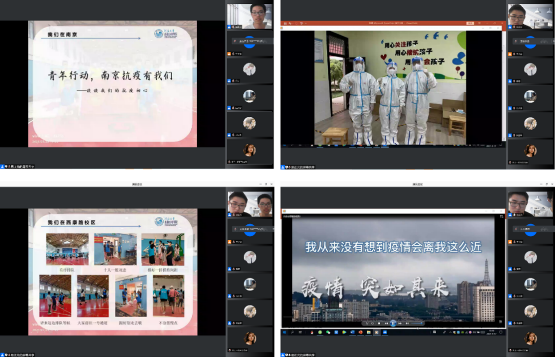 分享会上,2019级硕士生易正元、2019级本科生钱家豪和张亚琳分享了他们的战“疫”故事。结合精心录制的宣讲视频,向大家详细介绍本次抗疫志愿活动的经历和感悟。易正元和钱家豪同学在南京与疫情展开了80多小时的搏击,服务对象多达上万人,先后参与JJGirls 西康路校区、小市街道、宁海路街道、宝塔桥街道等的多次核酸检测工作。他们在宣讲中分享了自己在工作中的身影和在此过程中的学习体会和成长,抒发青年群体在本次战“疫”中展现的热血与激情,并借此机会勉励学弟学妹们运用课余时间为社会服务,贡献青春力量。