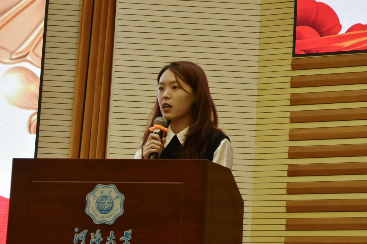 新生代表、2021级博士研究生周冰逸同学发言,提出作为研究生、水利人、新青年,心中应有“科研路”“水利梦”和“信念感”。她代表全体新生承诺,必将根系河海,胸怀祖国,放眼世界,成为新时代奋勇前进的搏击者,为祖国的水利事业倾注智慧、贡献力量!