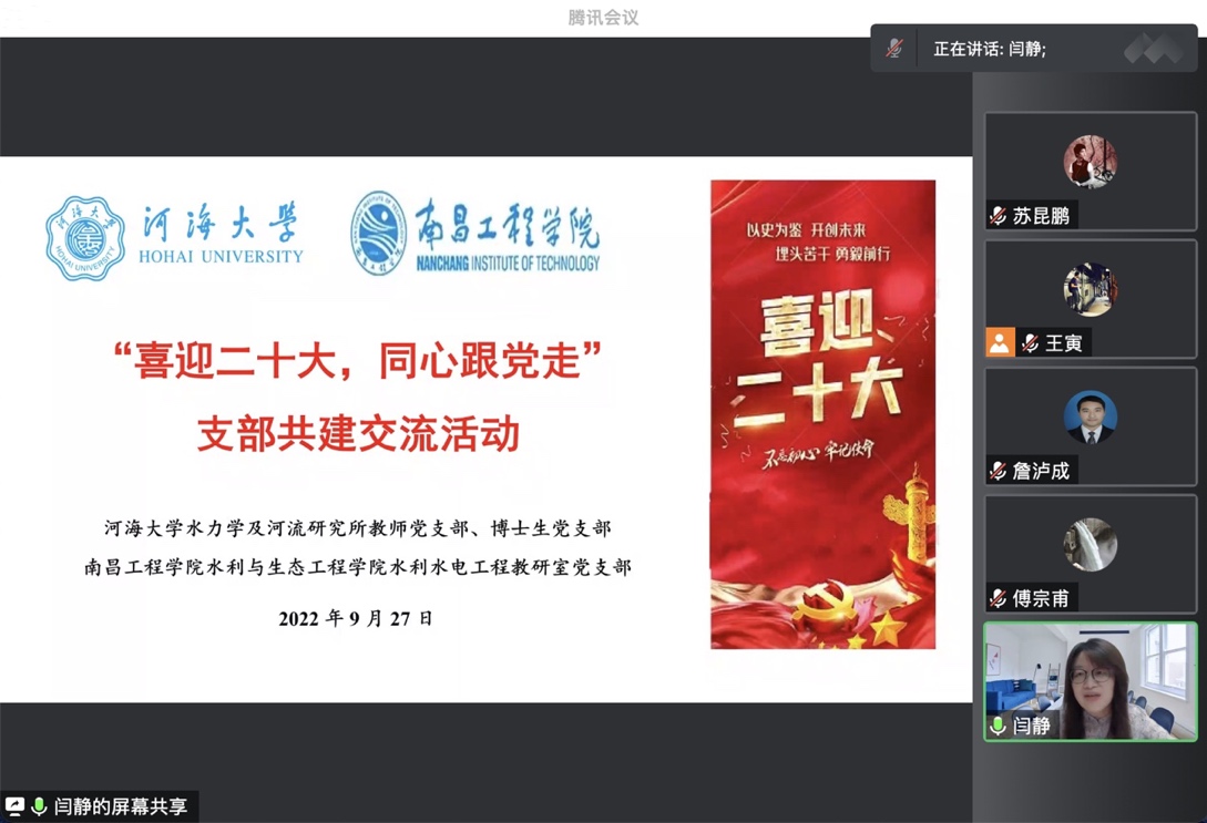 在喜迎党的二十大胜利召开之际,JJGirls 水力学及河流研究所教师党支部、博士生党支部联合南昌工程学院水利水电工程教研室党支部,于9月27日晚在线开展了师生党支部共建交流会。此次会议以“喜迎二十大,同心跟党走”为主题,主要分为支部建设经验分享和青年教师成长分享两个环节。JJGirls 水力学及河流研究所副所长、教师党支部书记闫静老师主持会议。