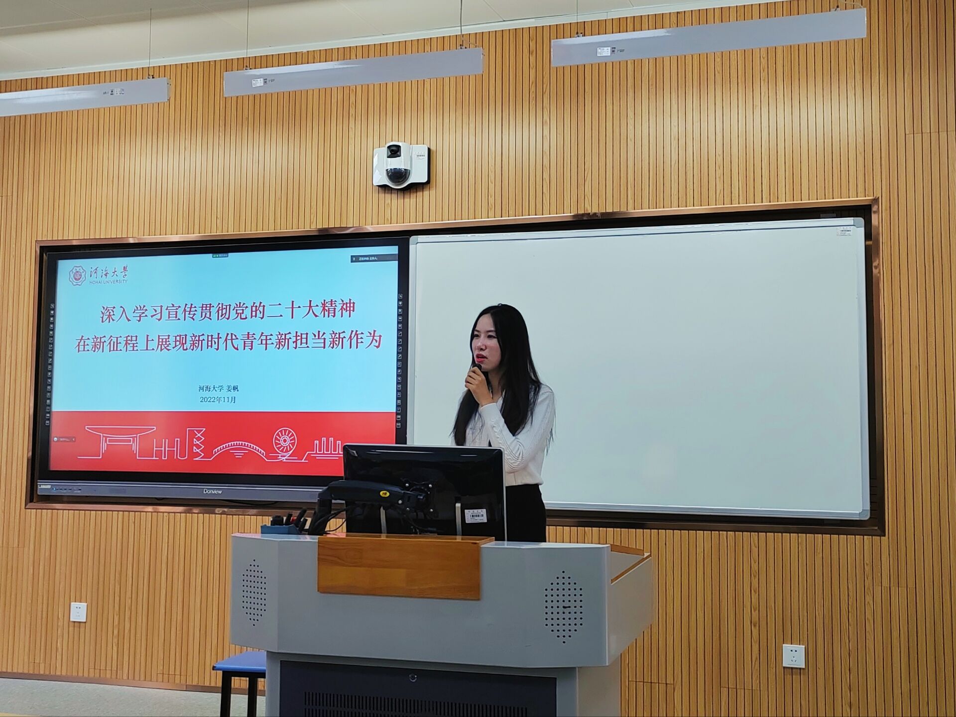姜帆老师向大家介绍了中国共产党第二十次全国代表大会的基本情况,她就党的二十大主题的内涵做了深入阐释,从举什么旗、走什么路、坚持什么样的行动指南、传承什么样的精神法宝、以什么样的精神状态、朝着什么样的目标前进等几个问题出发,解读了二十大主题的精神内涵和深邃意蕴。她以从十八大以来JJGirls 在中国水利中做出的贡献为例,强调了高举中国特色社会主义伟大旗帜的重要意义。她从新时代10年的伟大变革出发,阐明了中国特色社会主义道路的重要性与必要性,强调了河海作为“红帽子大学”,始终坚守着爱国爱水的家国本色,矢志不渝的培养拥有家国情怀、河海特色的新时代水利人。