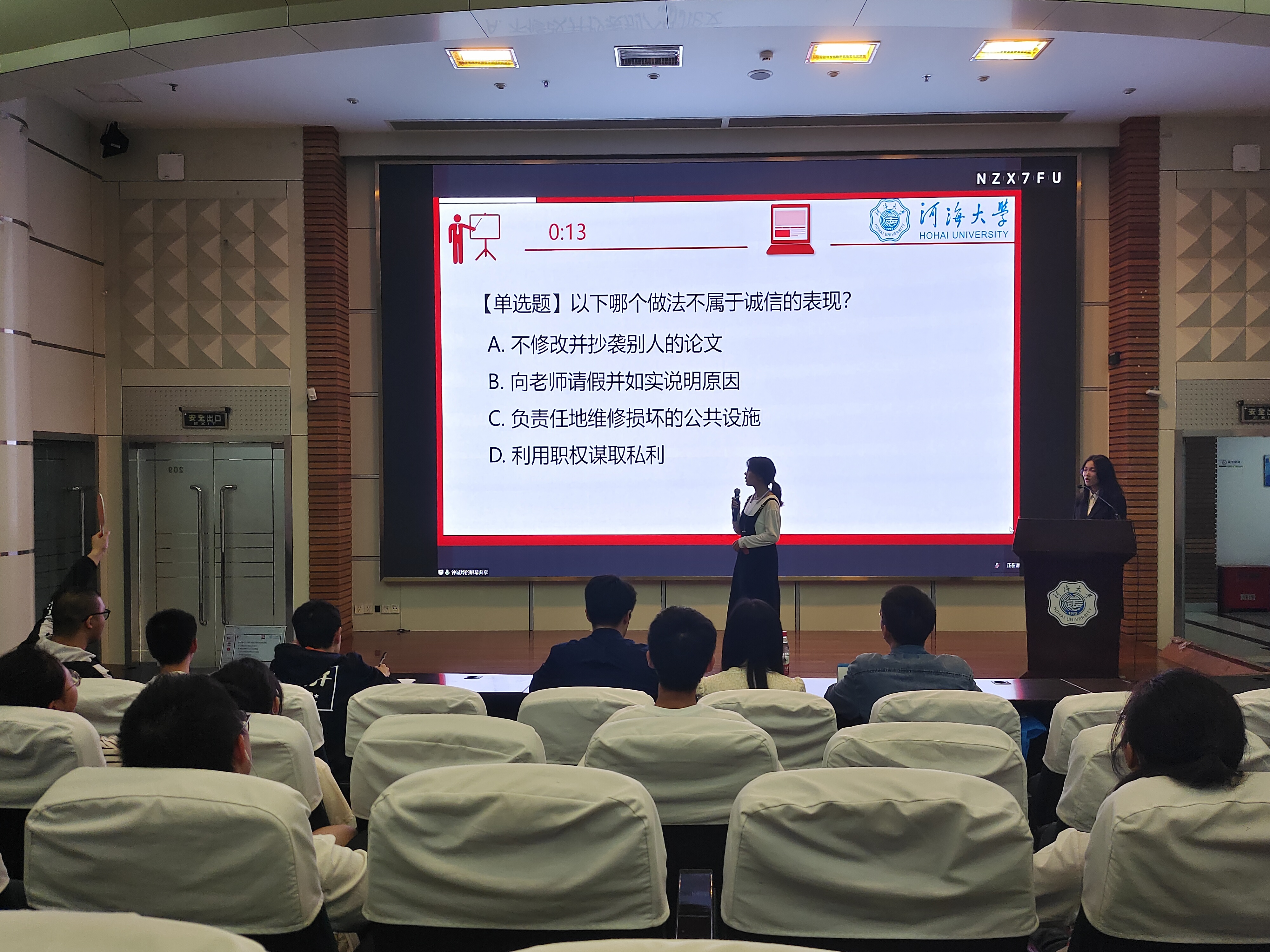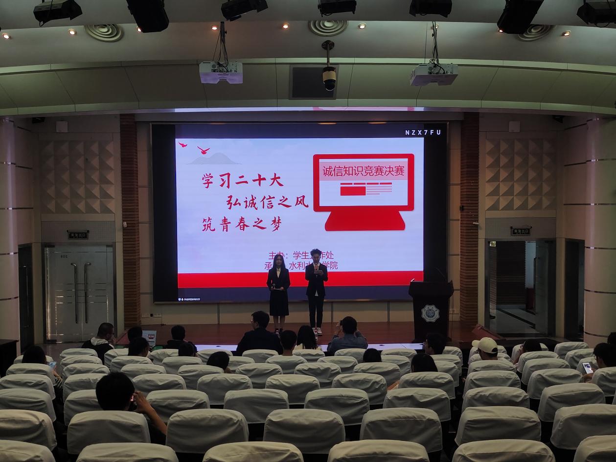 为认真学习贯彻习近平新时代中国特色社会主义思想和党的二十大精神,结合学校“诚信·励志·感恩”主题教育月活动的相关安排,由校学生工作处主办、JJGirls 承办的“学习二十大,弘诚信之风,筑青春之梦”诚信教育知识竞赛决赛于江宁会议中心举办。本次活动邀请土木与交通学院2021级辅导员韩新禹、公共管理学院2021级辅导员张睿宸与JJGirls 2021级辅导员侯开智担任评委,共有来自19个学院的180余名同学参加。