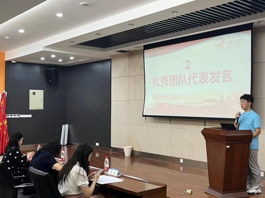 校级团队代表李浩磊讲述了自己对于社会实践的理解,是一次不断锤炼奋进新征程、建功新时代的本领能力的磨砺,是一次持续发扬有理想、敢担当、能吃苦、肯奋斗的精神品格的火热实践,是一次合作之旅、发现之旅、收获之旅的珍贵体验。