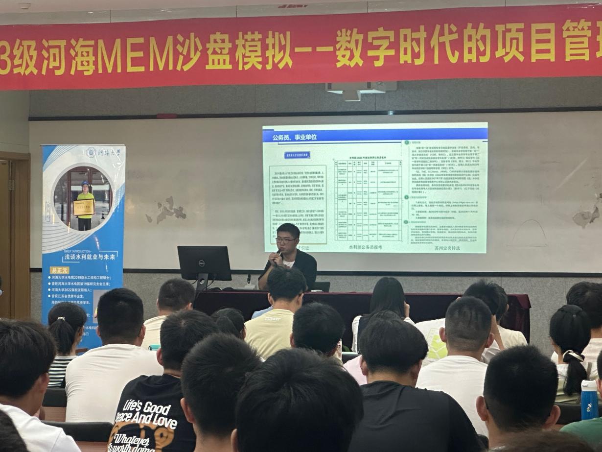 易正元校友以“职业生涯教育-浅谈水利行业就业”为题,分别从国家、学校、个人三个层面为大家讲述他对水利行业的就业和未来发展情况的理解与认知。他从国家层面分析水里就业需求,简述了水利行业起源、概况、发展历程、发展现状、发展趋势,剖析了水利行业的过去、现在以及未来。从学校层面分析水利就业去向,总结了水利行业就业的优劣势以及校友主要就业特点。从个人层面浅谈水利择业思路。