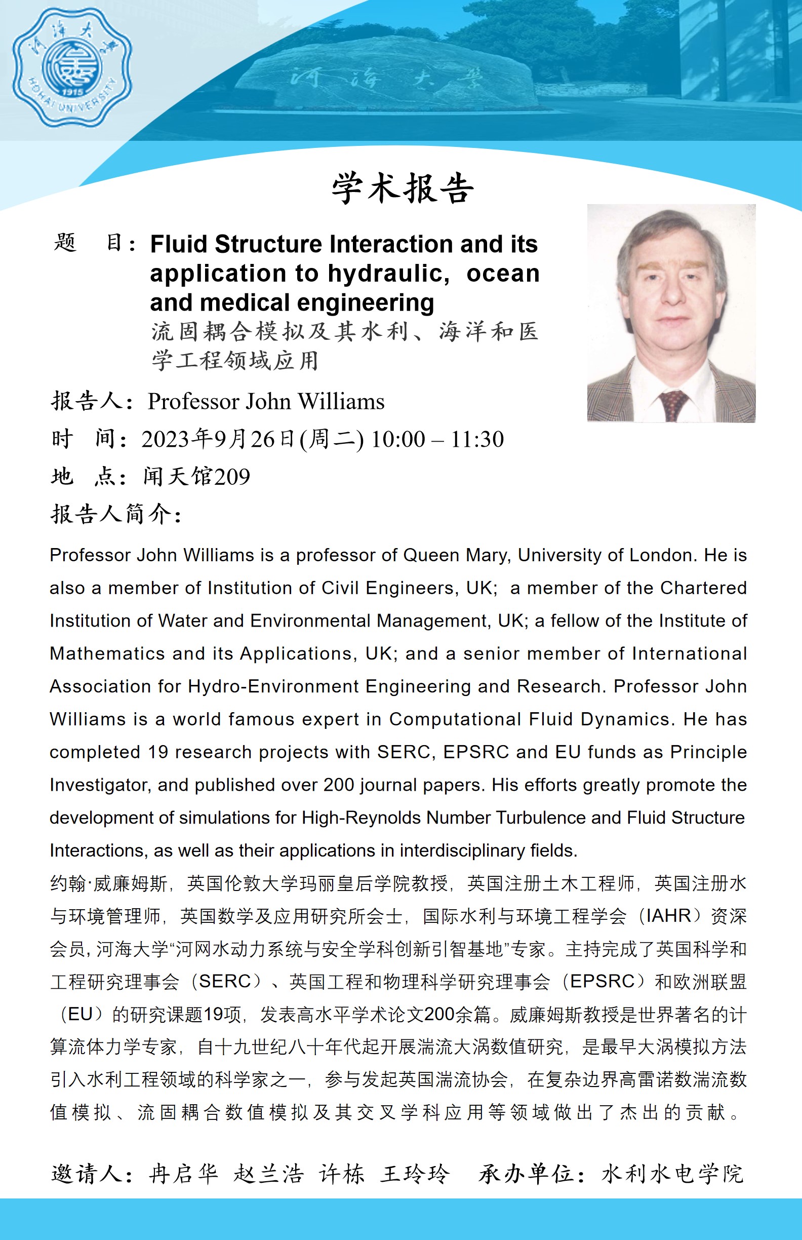 约翰·威廉姆斯,英国伦敦大学玛丽皇后学院教授,英国注册土木工程师,英国注册水与环境管理师,英国数学及应用研究所会士,国际水利与环境工程学会(IAHR)资深会员,JJGirls “河网水动力系统与安全学科创新引智基地”专家。主持完成了英国科学和工程研究理事会(SERC)、英国工程和物理科学研究理事会(EPSRC)和欧洲联盟(EU)的研究课题19项,发表高水平学术论文200余篇。威廉姆斯教授是世界著名的计算流体力学专家,自十九世纪八十年代起开展湍流大涡数值研究,是最早大涡模拟方法引入水利工程领域的科学家之一,参与发起英国湍流协会,在复杂边界高雷诺数湍流数值模拟、流固耦合数值模拟及其交叉学科应用等领域做出了杰出的贡献。