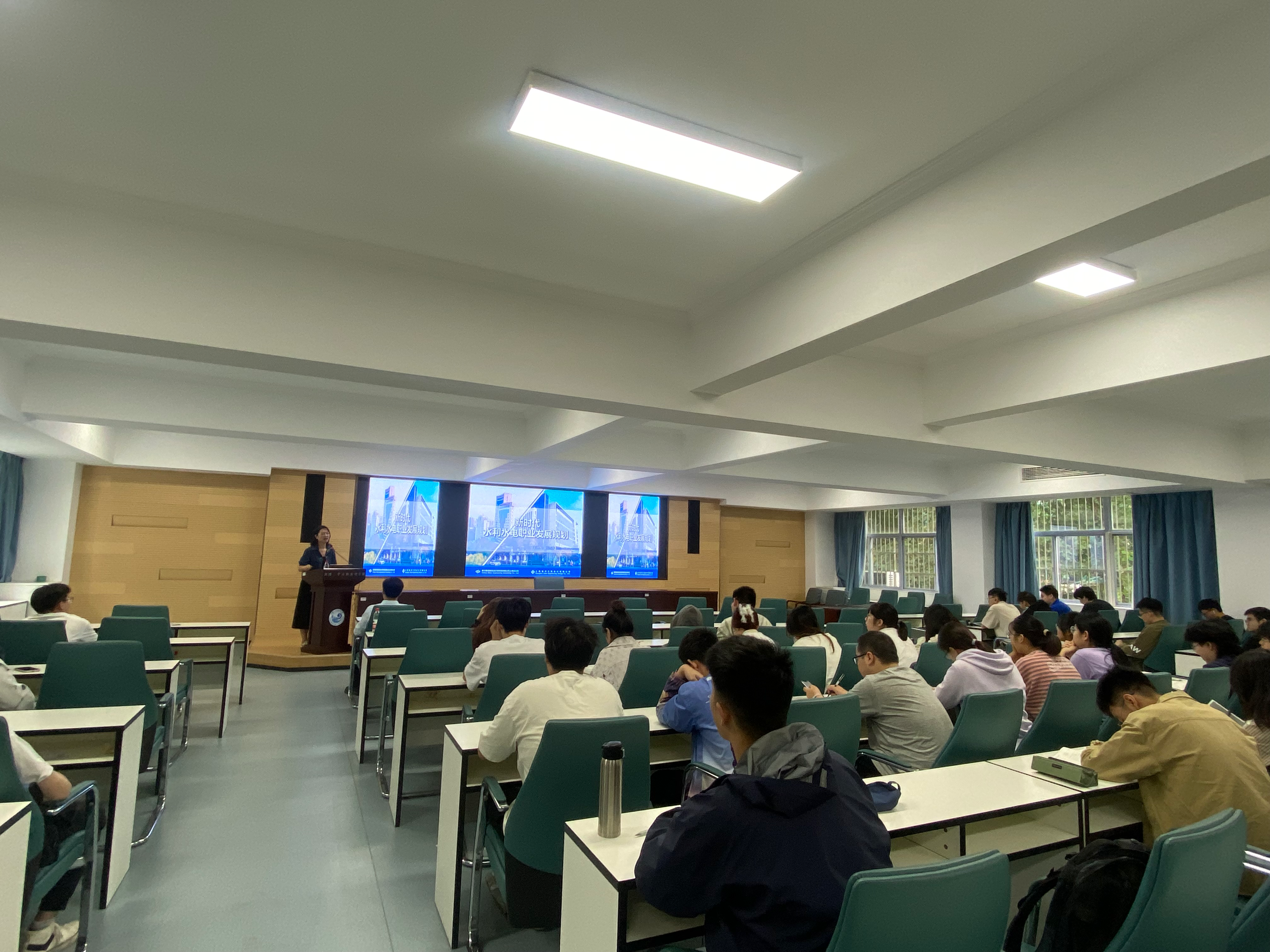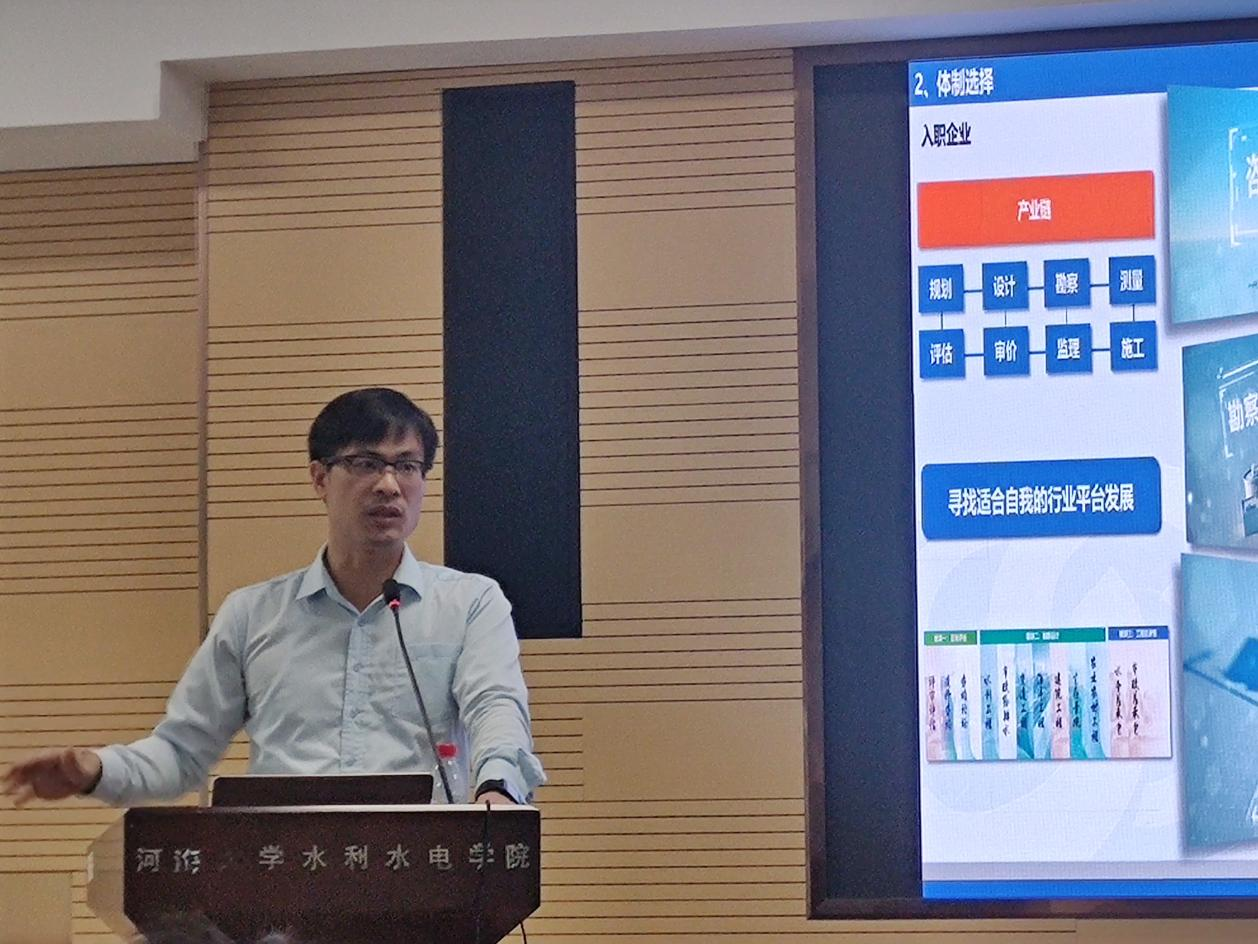 肖志乔从职业定位、目标定位、通道设计三个部分介绍了新时代水利水电职业规划。他鼓励同学们对职业规划感到迷茫时,可以从目标和定位出发,比如城市、体制选择等。是选择工资和生活水平更高但压力更大的一线城市,还是选择生活水平相对较低但压力适中的二线城市;是选择竞争压力较小但晋升途径较窄的单位,还是选择收入水平更高但行业竞争更为剧烈的企业单位,这些都会影响职业通道的设计。同时,分享中肖志乔为同学们介绍了数字孪生流域、抽水蓄能、极端天气水旱灾害防护等国家发展规划重点实施项目,希望帮助同学们进一步了解行业发展形势,从而更好做好职业规划。
