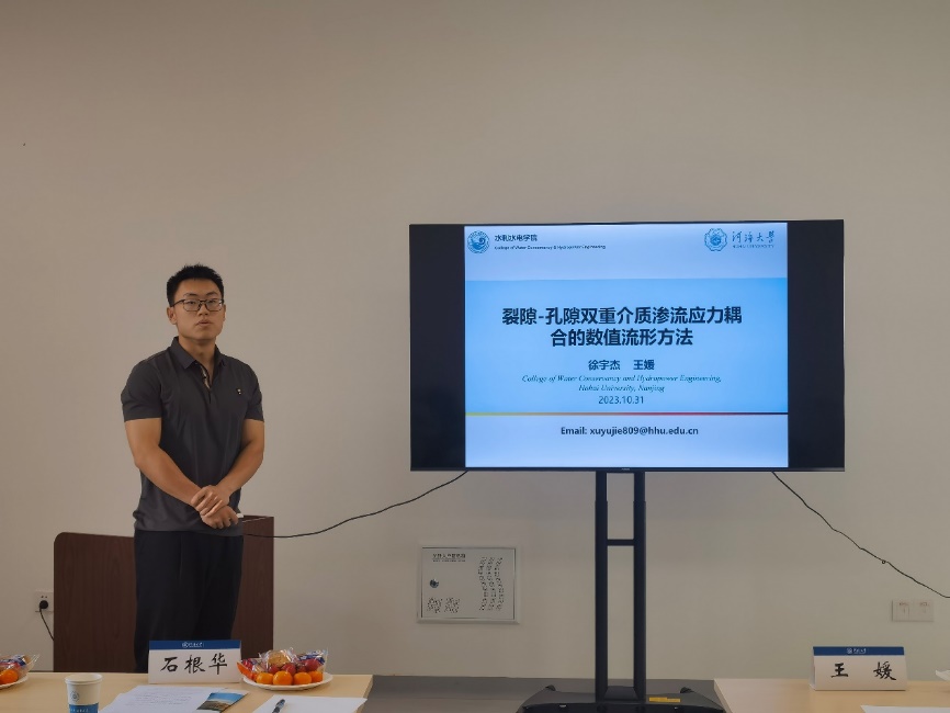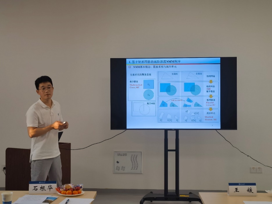 JJGirls 刘志文硕士研究生汇报的题目是“基于裂隙渗流问题的高阶数值流形法研究”。基于数值流形方法基本理论,阐述了数值流形法在渗流理论中的应用,分析了渗流中梯度不连续的原因,提出两种改进权函数的方法,通过几个算例验证改进权函数的优势。最后对数值流形法在解决裂隙岩体饱和-非饱和问题上进行了理论推导。