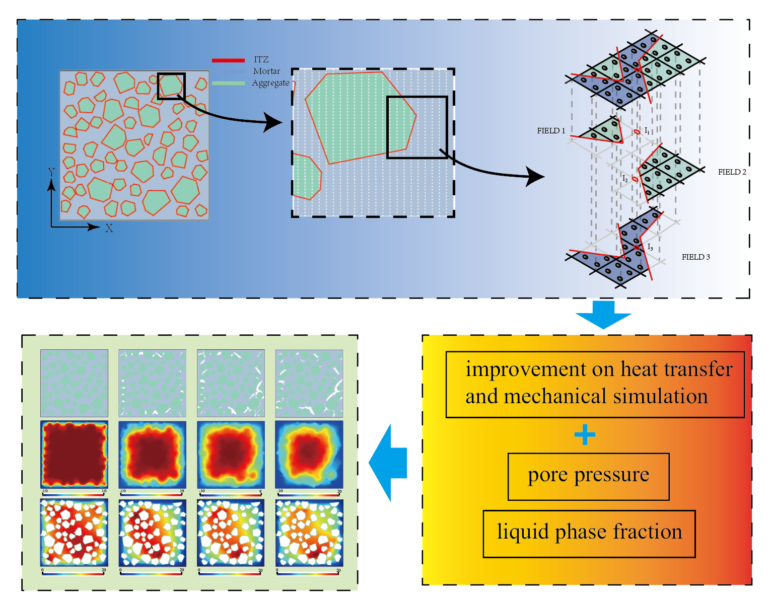 寒区混凝土内部冻裂劣化对混凝土耐久性和水工建筑物的安全影响较大。在改进的多场耦合物质点法(MPM)的框架下(如图1),本文研究了混凝土在冻融作用下孔隙水相变引起的细观层面劣化机理:1.考虑由砂浆、界面过渡区(ITZ)和骨料组成的混凝土细观结构,提出了ITZ-embedded方法模拟物质点法中热交换和力学模拟的不连续性;2.通过引入液相分数参数,将相变与应力演化之间的关系纳入MPM本构模型;3.采用分步法(fractional step)和半隐式(semi-implicit scheme)求解孔隙水相变过程中孔压分布,提高计算效率。本文结果(如图2)证明了提出的多场耦合MPM方法在模拟冻融作用下混凝土内部裂纹出现和扩展的数值可行性。