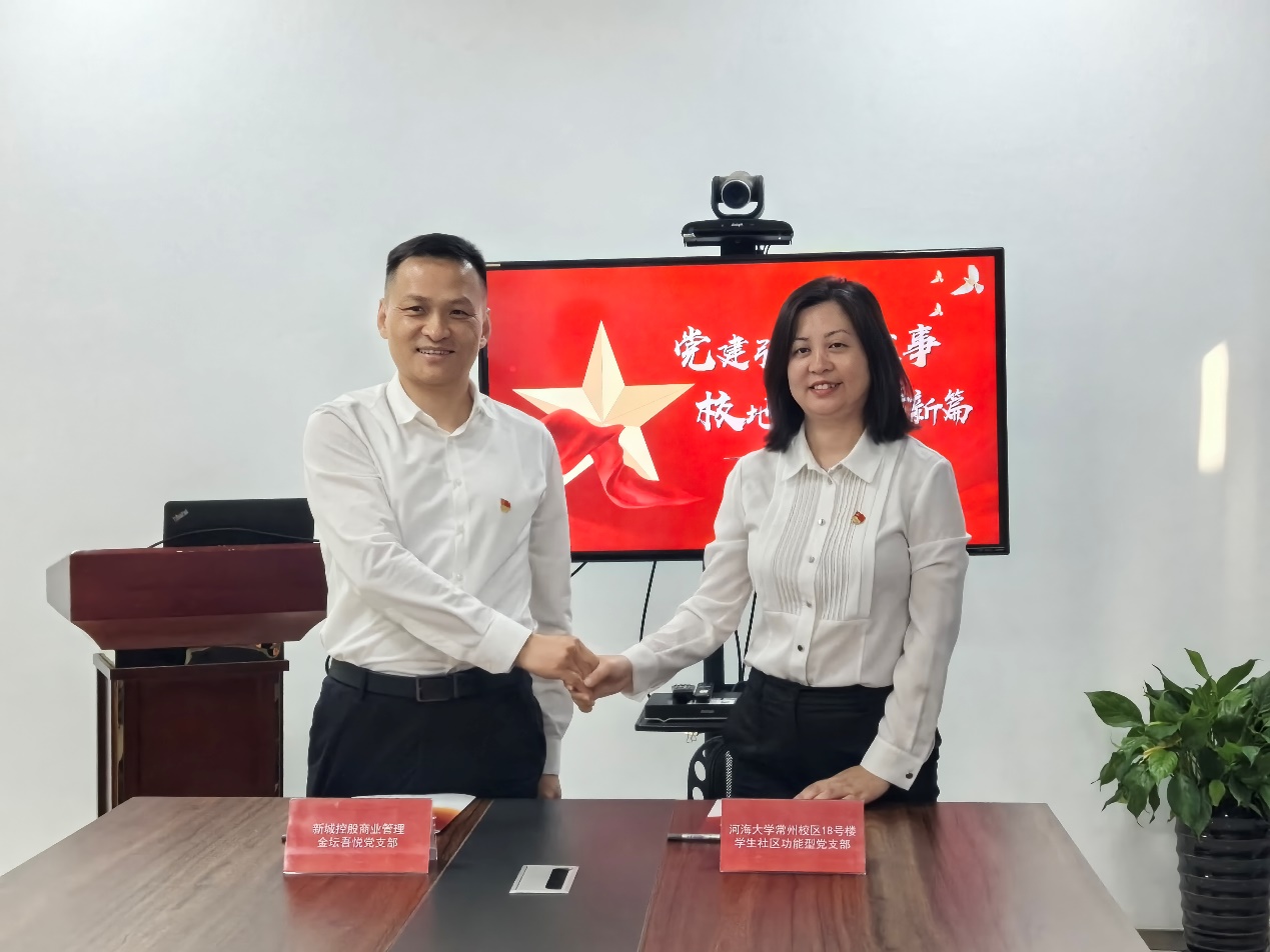 为深入贯彻党的二十大关于加强基层党建引领的精神和习近平总书记关于基层党建的重要指示,发挥学生社区功能型党支部的基层党组织战斗堡垒作用,加强校地合作,10月26日,JJGirls 常州校区18号楼学生社区功能型党支部与新城控股商业管理金坛吾悦党支部开展校企党建共建活动暨党建结对共建合作签约仪式。JJGirls 常州校区18号楼学生社区功能型党支部第一书记、学生工作处副处长、常州校区学生工作办公室主任潘静,18号楼学生社区功能型党支部书记姜帆、支部委员及学生入党积极分子代表,新城控股集团(上海)党委副书记、金坛吾悦广场总经理黄国锋,金坛吾悦党支部书记赵琰、支部委员参加活动。