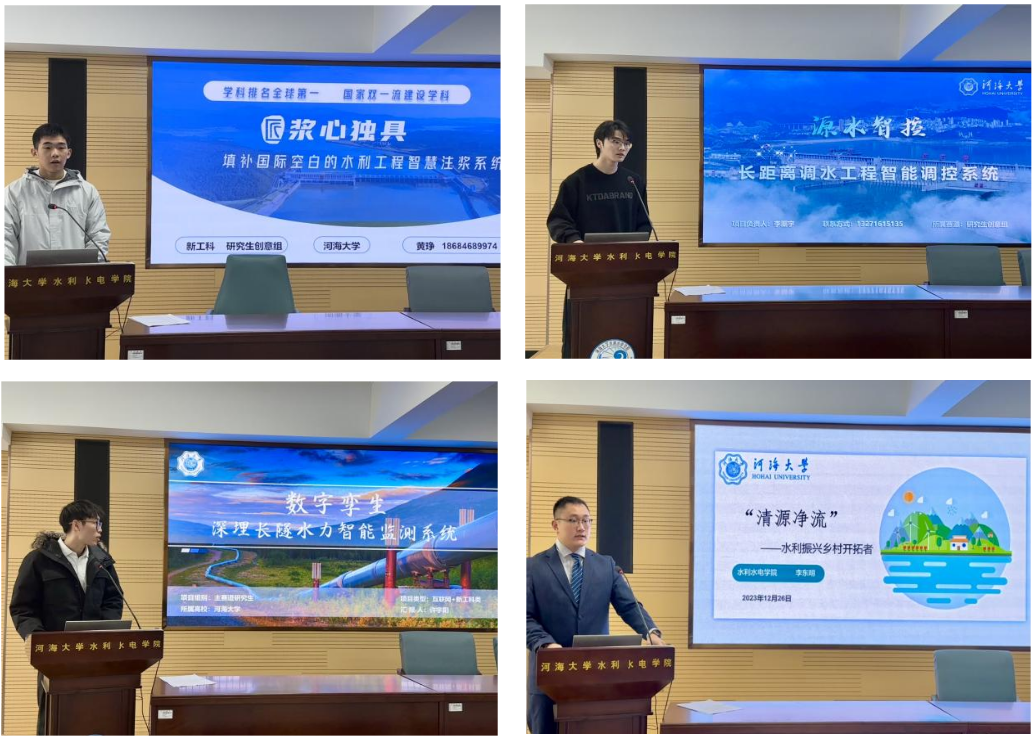 项目汇报阶段,《“浆”心独具—填补国际空白的混凝土智慧注浆系统》《长距离调水智能调控系统项目》《数字孪生-深埋长隧水力智能监测系统》《“清源净流”—水利振兴乡村开拓者》等项目的负责人,结合PPT展示,生动形象的向在场的评委和观众们介绍了项目的行业背景、专业痛点、技术创新亮点、商业模式、未来发展计划等情况。各组展示结束后,评委围绕参赛要点、项目主题、汇报内容等方面,与各小组成员展开了更加细致而全面的的讨论,给予了专业的指导和建议,让参赛成员清楚了当前存在的问题以及下一步的努力方向。