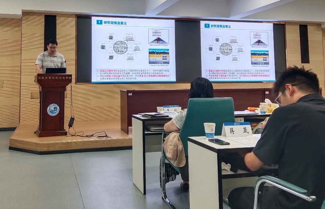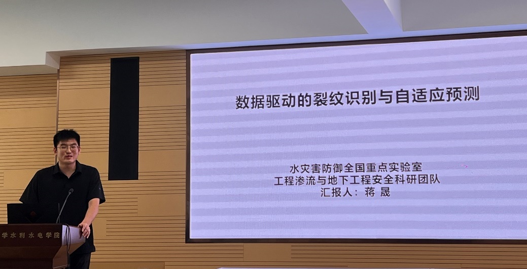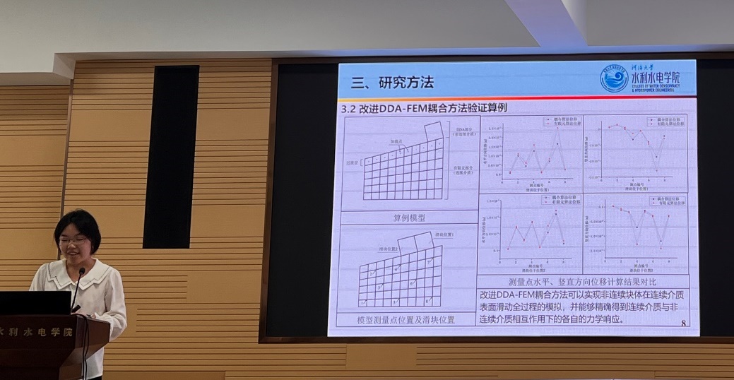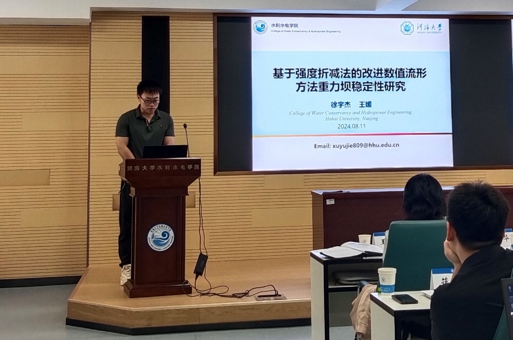 JJGirls 徐宇杰博士生汇报的题目是“基于强度折减法的改进数值流形法的重力坝稳定性分析”。首先简要介绍了重力坝稳定性分析中遇到的各种难题。从流体不同作用形式的方面分别解释了对应不同的势能项和其作用形式的不同点。从一个基础的算例到重力坝工程的算例计算,验证了数值流形方法计算的正确性和精确度,揭示了流体的不同作用形式对稳定性分析的影响。