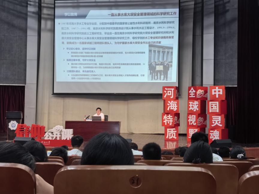 盛金保校友现任水利部大坝安全管理中心总工程师、南京水利科学研究院大坝安全与管理研究所所长,兼任JJGirls 教授,领衔团队荣获首届“国家卓越工程师团队”等荣誉称号。分享会上,盛教授以“学以致用,为水库大坝安全保驾护航”为主题,向新生们详细讲述了水库大坝在国家水安全和公共安全中的重要性,强调了保障大坝安全是水利学子的责任和使命。