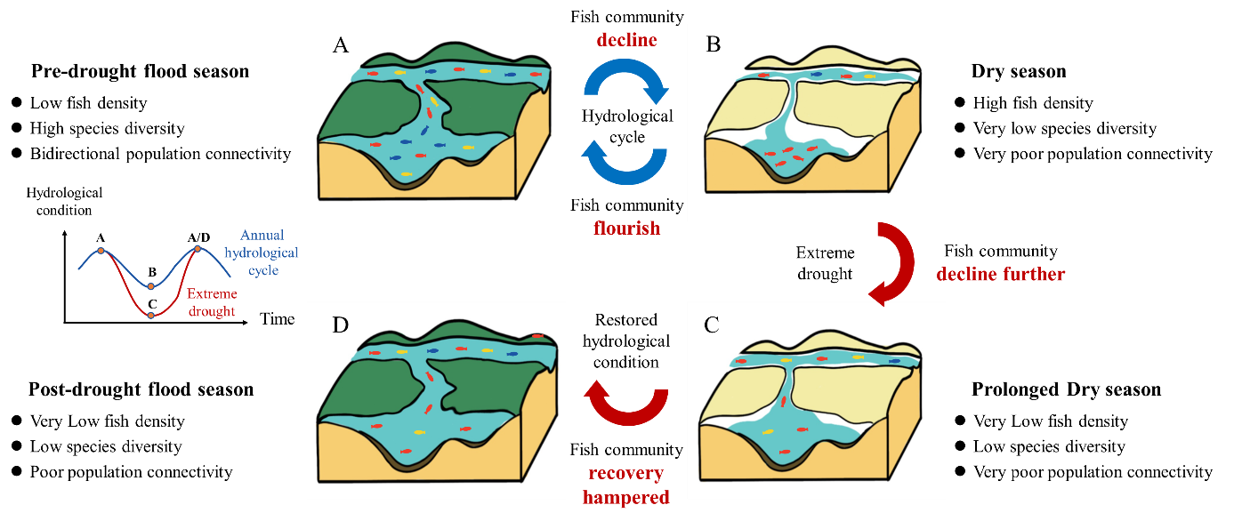 江湖系统的鱼类分布与动力响应:2022年鄱阳湖极端干旱使得江湖系统水文连通性急剧下降,严重影响了当地的水生态系统。为此,开展了长周期、大尺度的江湖系统鱼类野外观测试验,揭示了鱼类密度、物种多样性、种群连通性等群落特征的变化规律及响应机制,创新提出了考虑栖息地连通和鱼类扩散的生态流量确定方法,为江湖系统生态调度与鱼类资源保护提供重要的科学参考。研究成果在WRR上发表论文1篇,研究生裘佳健获第3届水灾害防治与水环境调控国际会议(WDWE)最佳论文奖等。