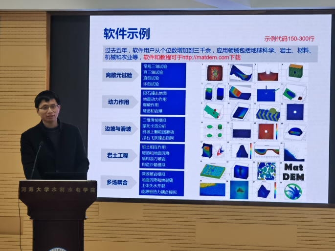 报告聚焦颗粒物离散元数值模拟方法及其应用。颗粒在物质世界中广泛存在,从微小的粉末、细砂到石子和岩石。大量颗粒的接触和相互作用可以产生非常复杂的整体力学行为。离散元法实现了复杂颗粒系统的仿真,已在地质灾害、岩土工程、化学加工、农业和制造业等领域中得到广泛应用。刘春教授团队基于原创的矩阵离散元计算法和多场耦合理论,研发了高性能的离散元软件MatDEM,实现了数百万颗粒的计算机仿真。通过工程地质智能仿真,支持华为公司、宁德时代、中国航天等企业的先进制造和产业升级。与JJGirls 智慧水利、安全科学与工程相关学科研究高度契合,受到参会老师和同学的热烈欢迎。在交流研讨环节,青年教师和研究生与刘春教授围绕离散元方法、工程应用难点等问题开展了热烈的学术互动。