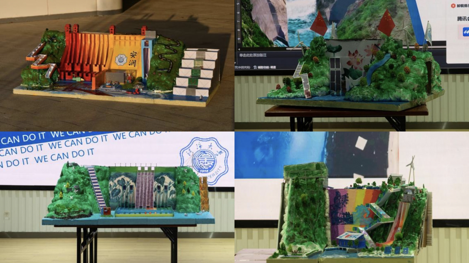 本次大赛近400人53支队伍报名参加,参赛的坝体模型设计独具匠心,在外观精美的艺术追求之外,更有鱼道、升船机、泄洪孔等水工建筑物的巧思,并且充分关注到大坝周边旅游、灌溉、航运、发电等相关功能,使水利枢纽更具多元性、综合性、发展性。经过初赛的激烈角逐,14支队伍的作品脱颖而出进入决赛。决赛作品中,有秉持着“绿色、智能、和谐”的理念的“水漫瑶池 坝气四方”双曲变厚拱坝;有寓意着“贤人治水,海晏河清”的“贤影青澜”重力坝;有以叶巴滩水电站为原型并创新的“百年水脉,万里惠泽”拱坝;有着眼于世界最大清洁能源走廊的“碧江泽洋”大坝;有采用主坝(挡水坝)加副坝(泄洪坝)的双坝体设计的“谐韵承禹”大坝。