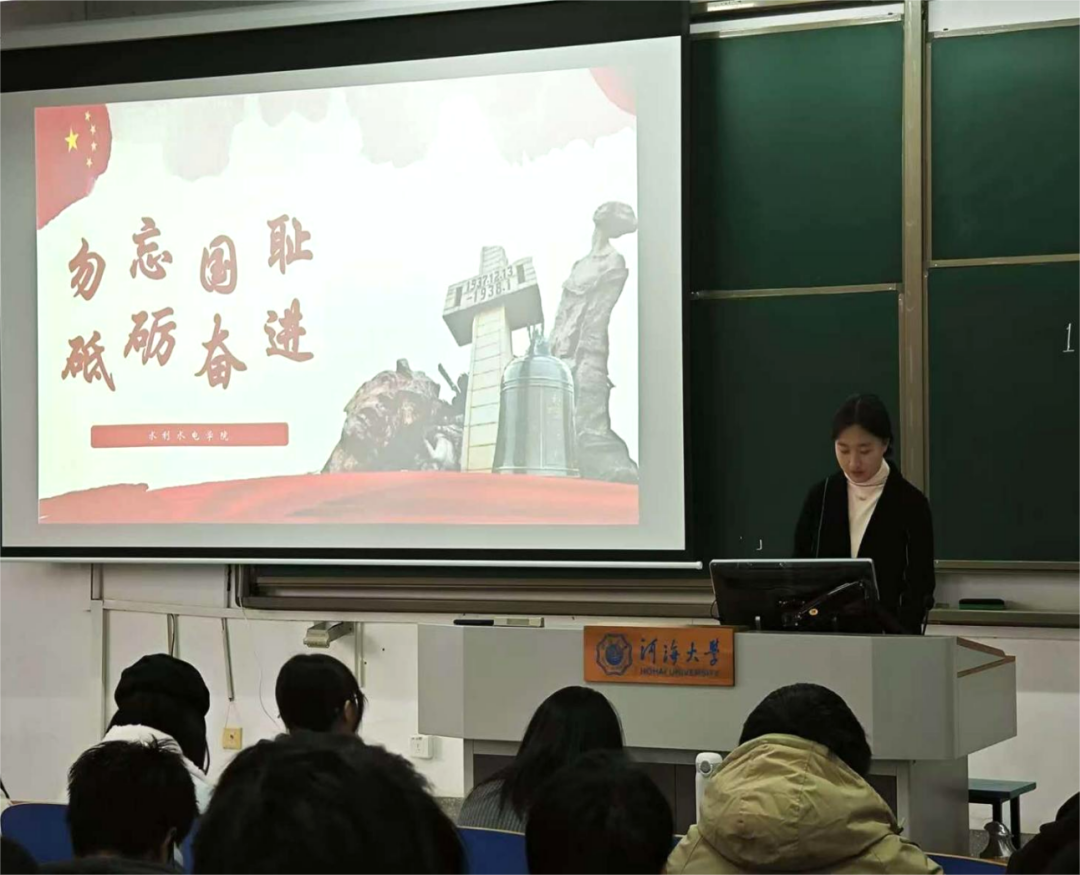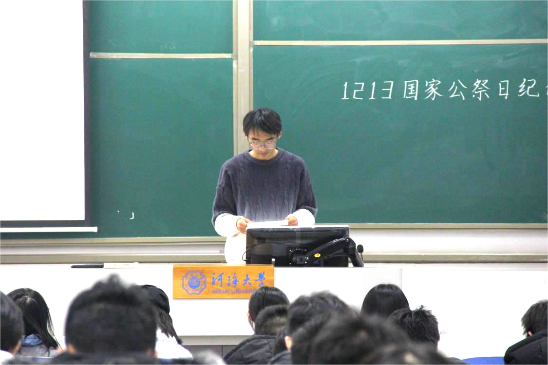 活动开始后,主持人院团委李佳怡神情庄重地登台致辞,讲述了八十七年前南京大屠杀那段沉重的黑暗历史。随后,同学们全体自发起立,为遇难同胞默哀三十秒,在静默中向遇难同胞们致以深切的哀思。