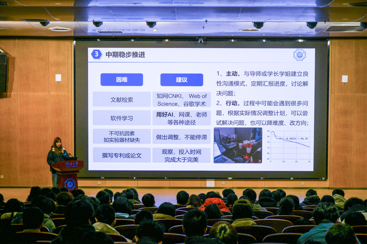 卢姿睿学姐从其参与的国家级立项和参与“全国大学生水利创新大赛”的经历为出发点,详细地阐述参与大创每一个过程应该如何把控,在参与过程中遇到了未曾预料到的困难该如何解决,全方位、高领域、多角度地展现大创赛事背后的艰辛与不易。在整个分享过程中,卢学姐主要强调了专利论文发表的时间问题,提醒各位同学论文的发布需要紧跟赛事进程。