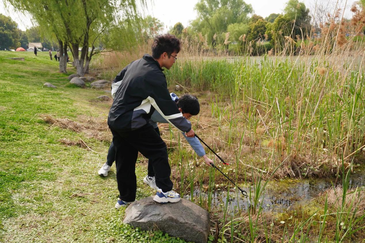 随后,同学们前往南京九龙湖公园开展巡河与河道垃圾清理行动。在负责人的指引下,同学们沿着湖边仔细巡查,观察湖水水质,记录所发现的问题,如水体颜色、气味等异常情况。同时使用垃圾袋、夹子等工具,清理河道及湖边遗留的的塑料瓶、食品包装袋、烟头等。巡河结束后,大家对垃圾进行分类处理,可回收垃圾交由公园管理人员回收,不可回收垃圾则按规定处理。