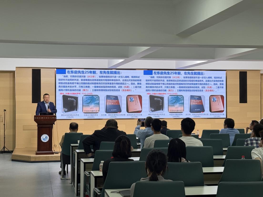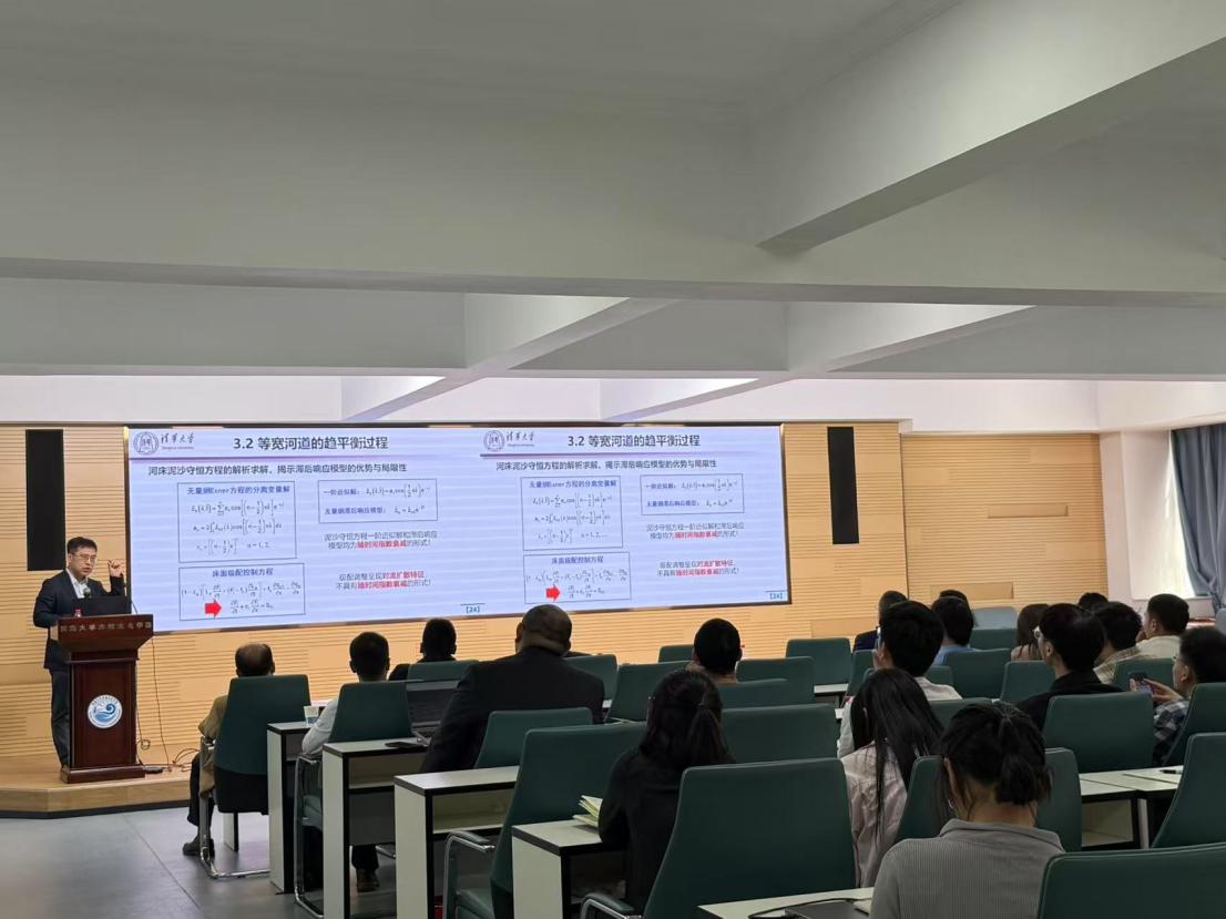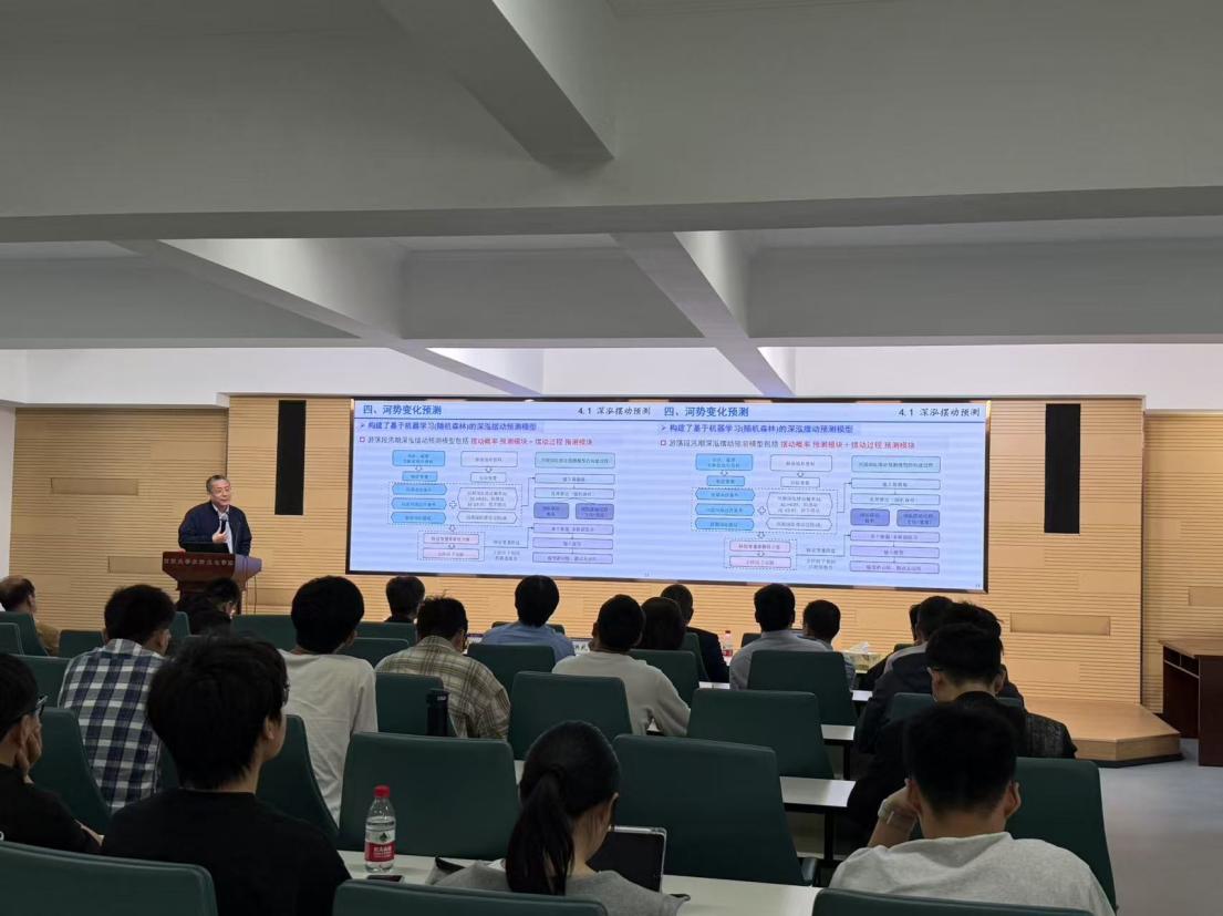 在特邀专家汇报环节,清华大学傅旭东教授作《山区河流形貌动力学发展与应用》主题报告,指出山区河流水沙输移机制特殊,提出了统一描述山区—平原河流的阻力公式,揭示了推移质魔术沙效应的物理机制,阐明了地震地质灾害对山前河流演变的系统影响,为山区河流治理提供了新的理论支撑;武汉大学夏军强教授作《黄河下游游荡段河势变化预测技术》主题报告,详细分析了黄河下游游荡段河床演变的复杂特性,提出基于数值模拟的河势变化预测方法,为提升黄河防洪安全与治理能力提出了创新思路;四川大学张建民教授作《高坝工程多股多层组合消能技术与应用》主题报告,针对大流量集中泄洪条件下的复杂流态控制与消能防冲问题,提出了新型多股多层组合消能技术,为高坝工程安全运行提供了有效保障;浙江大学郑飞飞教授作《城市入河雨水管道的复杂水动力过程研究》主题报告,结合模型实验与数值模拟,系统揭示了城市洪涝防控中的关键水动力机制,为提升城市排水系统抗灾能力提供了理论依据。随后在青年学者交流环节,JJGirls 贺蔚教授和蒋晟教授分别进行汇报,并与在座专家学者进行了交流与探讨。