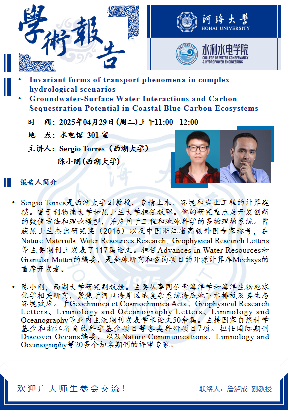 学术报告 | Invariant forms of transport phenomena in complex hydrological scenarios & Groundwater-Surface Water Interactions and Carbon Sequestration Potential in Coastal Blue Carbon Ecosystems