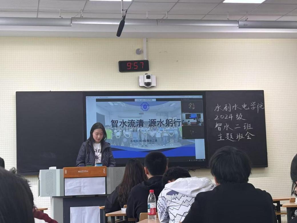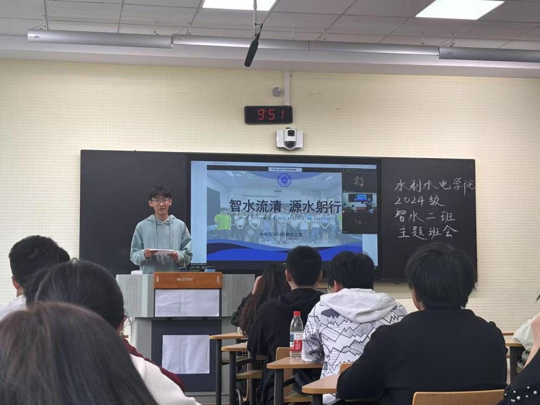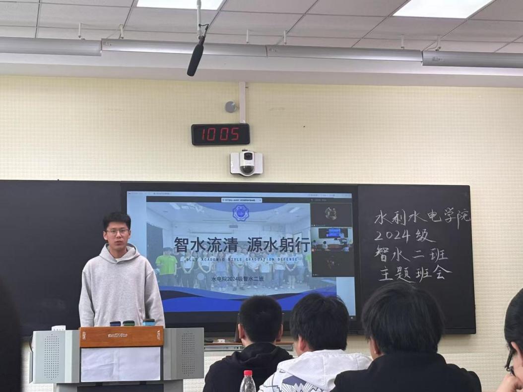 2024级智水二班班长石程云展示了班级上学期的成果,包括班级平均绩点稳居专业前茅,班级同学积极参加社会实践,班级志愿活动做到全员参与等。团支书李佳怡分享了团支部建设经验,通过举办“行业专家进班级”“红色教育基地参访”等特色活动,激发团员责任感与使命感。