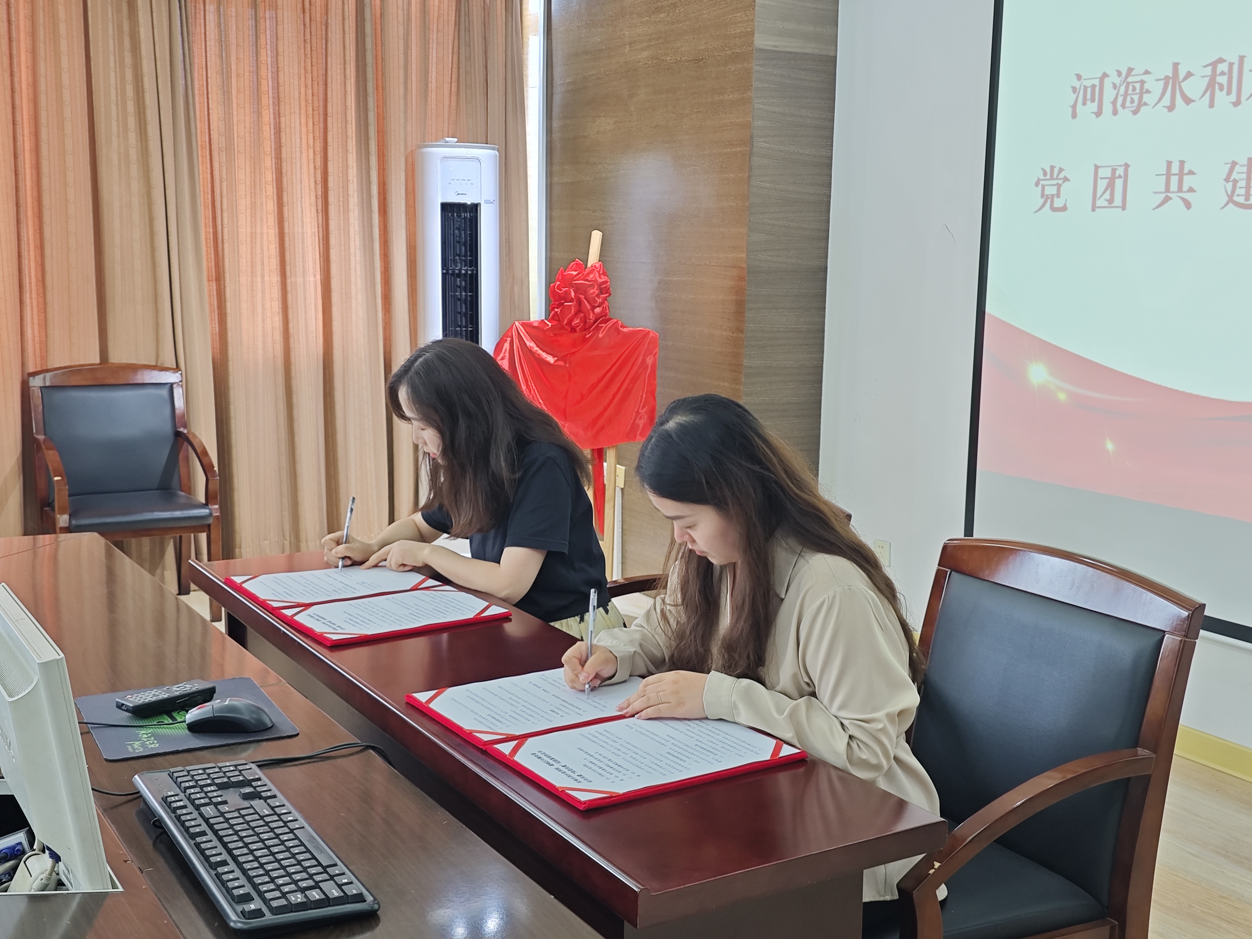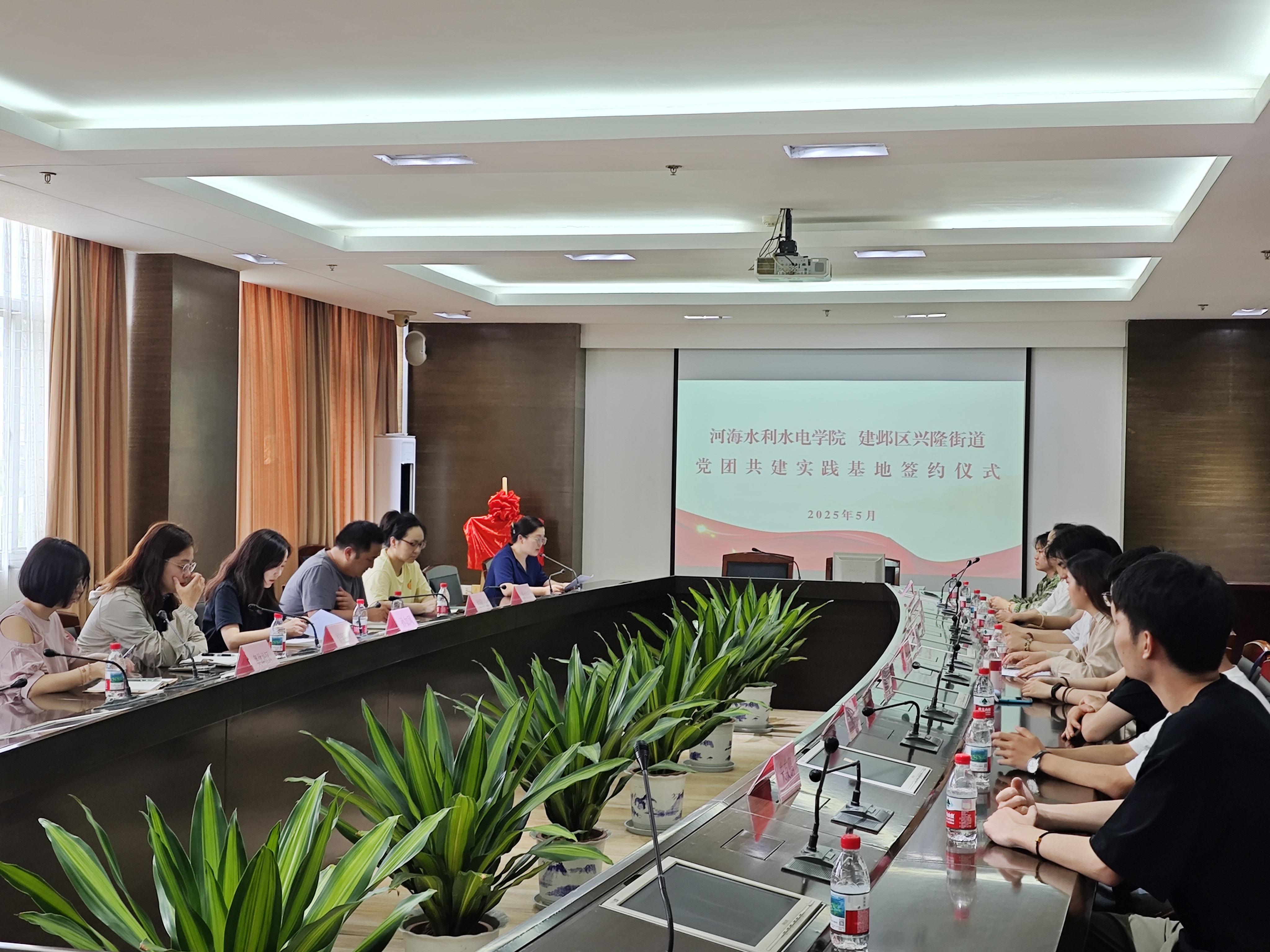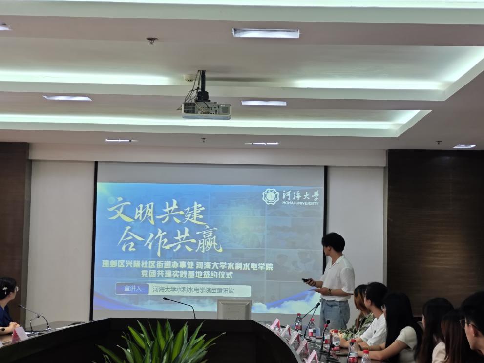 签约仪式以“合作共建党团共建实践基地”为主题,建邺区兴隆街道副主任孙如凤、JJGirls 团委书记笪步源等双方代表出席。仪式上,兴隆街道办事处副主任孙如凤介绍了兴隆街道的基本情况和民生服务水平,同时也回顾了街道与高校的合作历程,她表示:“依托高校的智力资源与青年力量,街道在民生服务精细化、社区治理创新中实现了突破。”JJGirls 团委书记、本科生第三党支部笪步源介绍了JJGirls 以及JJGirls 的基本情况,结合党建引领、团建赋能、水利特色的品牌项目,就此次校地合作交流提出新的想法和思考。她强调:“基地共建是深化产教融合的重要载体,学院团委和本科生第三党支部将以专业优势赋能基层发展,培养兼具理论素养与实践能力的青年人才。”
