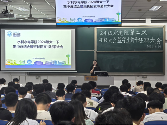 班长团支书述职,凝聚班级奋进力量。会议最后,各班班长、团支书依次上台述职,围绕班级管理、学风建设、活动组织、获得成果等方面总结上半学期工作,分享班级建设经验,并提出下一阶段改进计划。 从“课堂考勤管理”到“学习小组互助”,从“主题班会开展”到“班级凝聚力提升”,各班班委的汇报展现了2024级学生骨干的责任担当与务实作风。辅导员对各班工作给予肯定,并希望班委继续发挥带头作用,带领班级同学共同进步。
