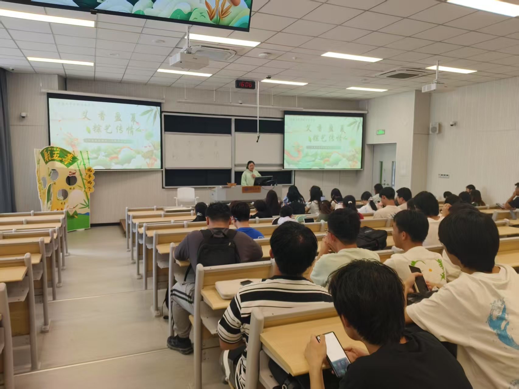 古俗今人讲,一席端阳长。团支书吕珏稞为同学们介绍端午节的节日由来与发展历程,进一步讲解民俗体验活动中包粽子、射五毒和投壶的相关步骤以及游戏规则,并组织现场同学自由分组,参加接下来的活动内容。