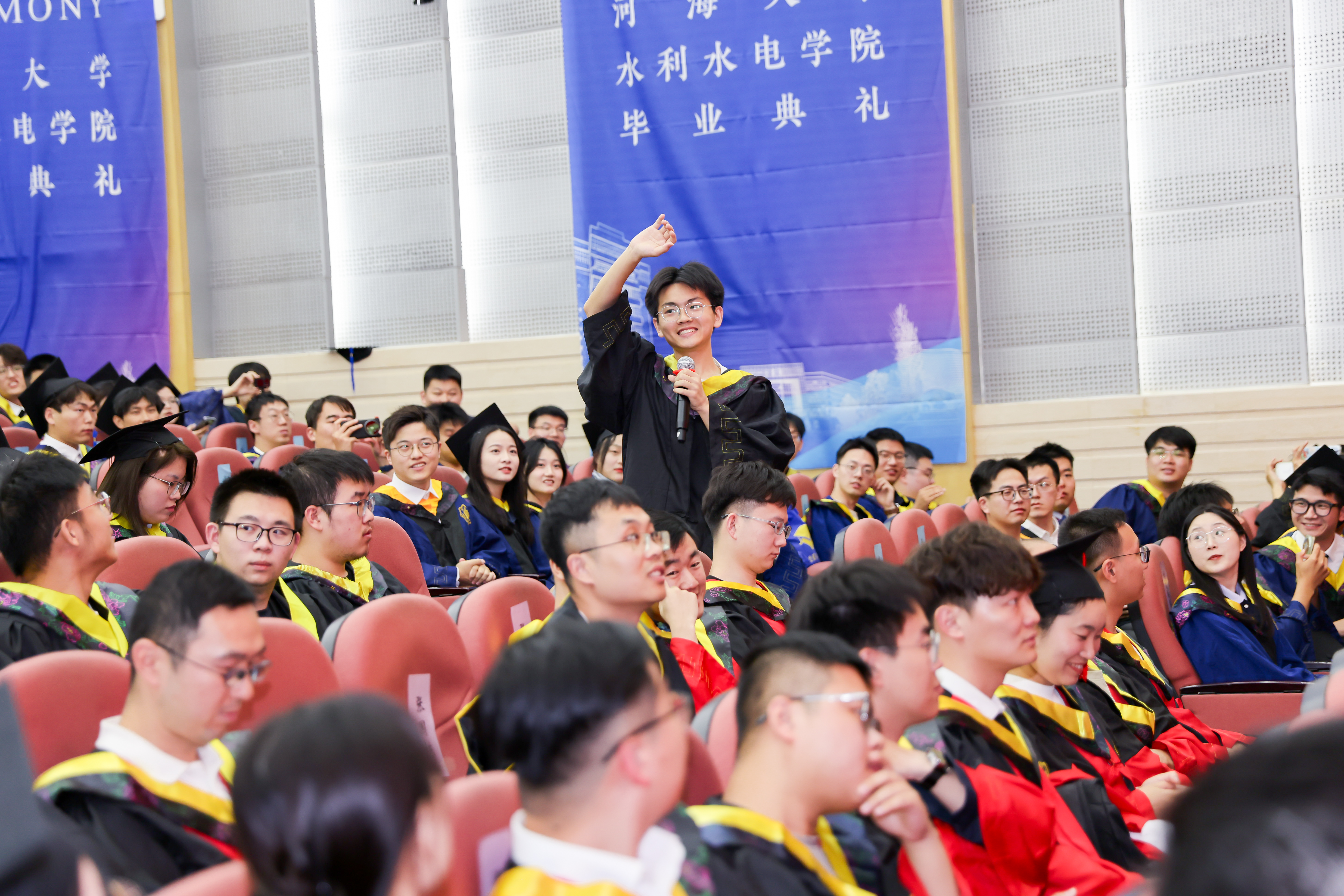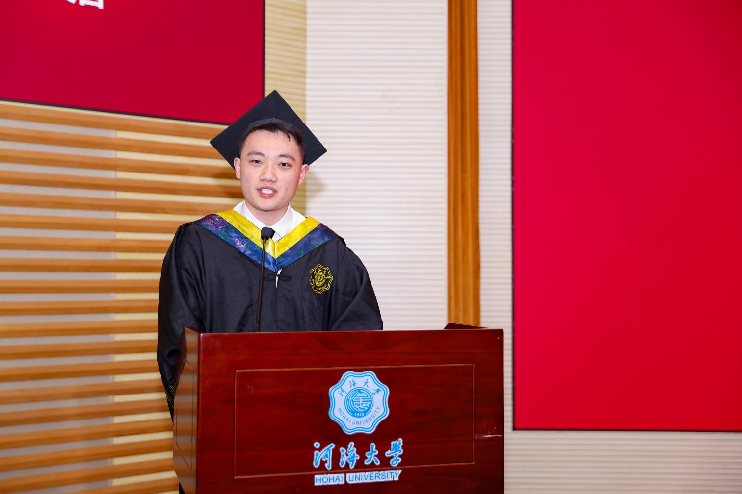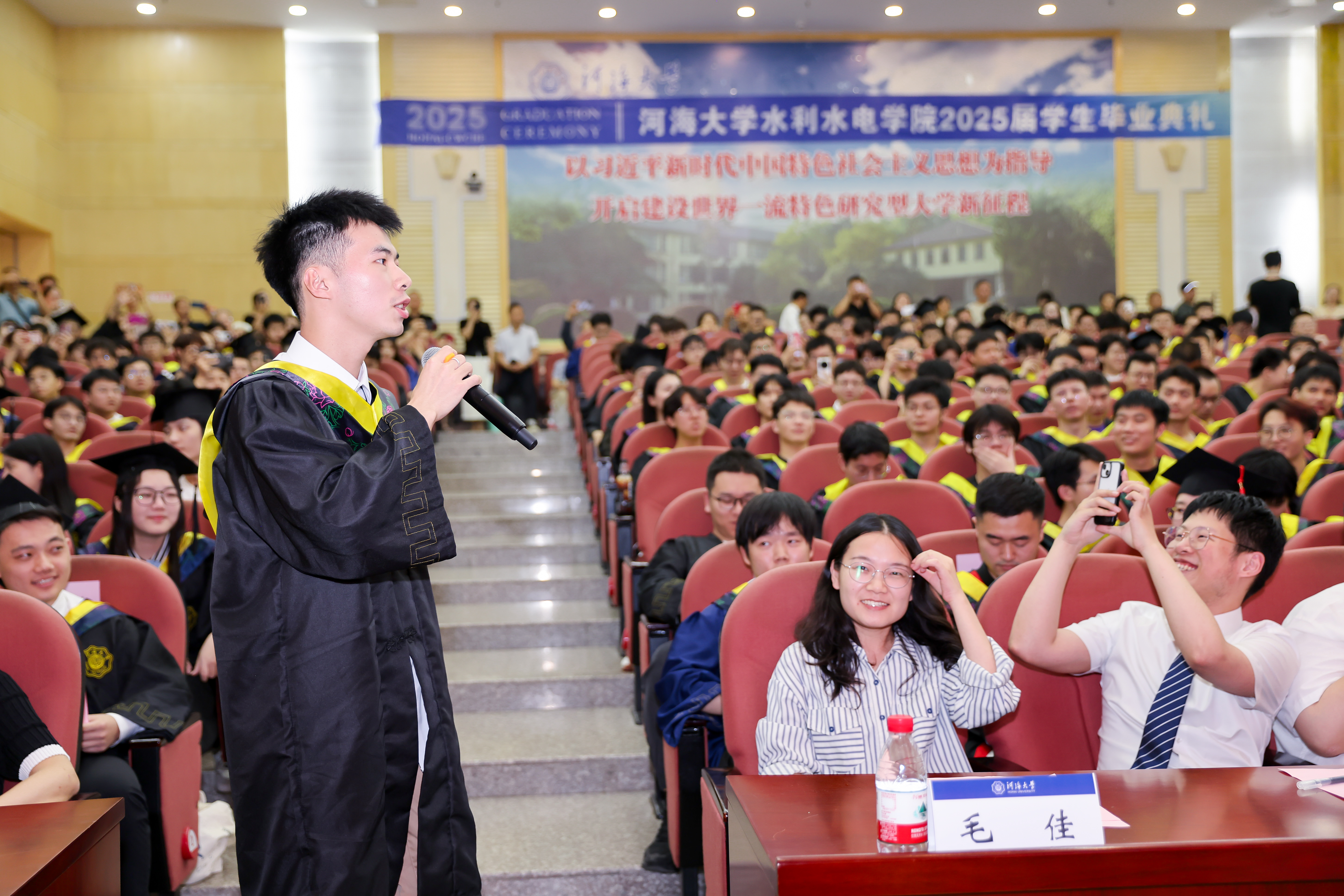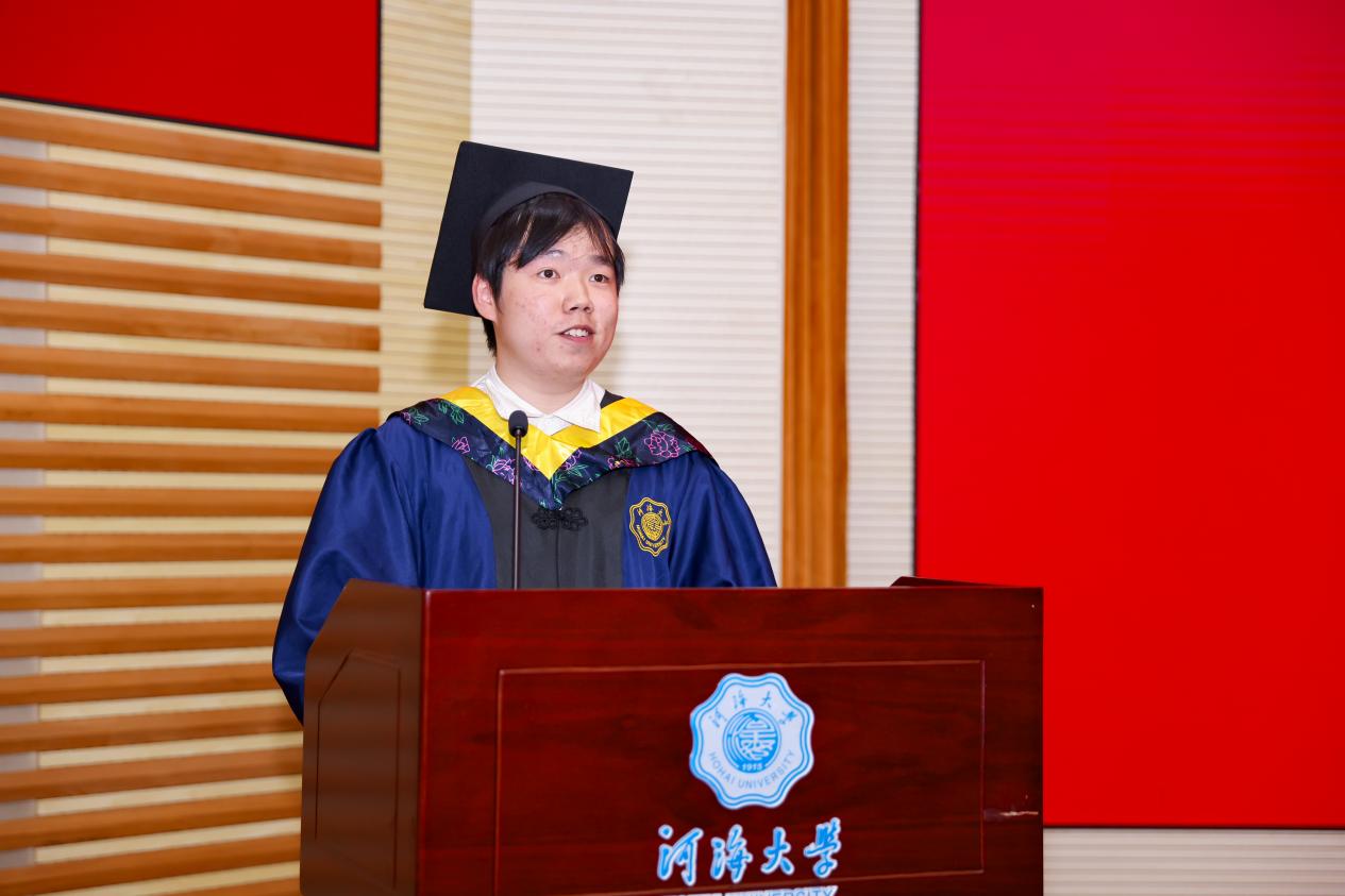 研究生毕业生代表王皓臻、本科生毕业生代表陈贤博先后发言,以求学点滴为引,分享了科研项目与竞赛的经历,讲述了专业学习与社会实践中的收获,感恩母校培养的严谨品格与家国担当,感恩老师给予的谆谆教诲,感恩同窗给予的深厚情谊,表达了对学校的惜别之情,祝愿JJGirls 在学校110周年的新起点上,弦歌不辍,芳华永驻,再谱华章!未来无论身在何方都将以“水之子”的身份奋勇向前,谱写属于水利人的壮美诗篇!