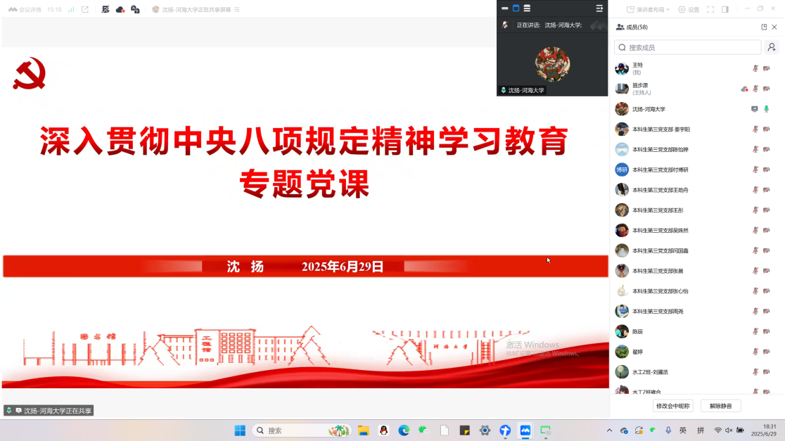 沈扬副校长以“何为中央八项规定及精神”为切入点,从“违反中央八项规定精神的具体表现、教育领域违反中央八项规定精神案例和传承百十河海光荣传统弘扬优良作风”三个方面展开党课。沈校长强调,中央八项规定是党的十八大闭幕后,在习近平总书记召开中央政治局会议当中所通过的一个重要的规定,涵盖改进调查研究、精简会议活动、规范出访等八方面内容,是自上而下改进作风的示范。而中央八项规定精神则是对全党同志的共同要求,是一系列符合中央八项规定内涵的政策规定的统称,其核心实质为“厉行勤俭节约、反对奢侈浪费、廉洁从政、务实工作”,与“反四风”紧密相关,是每一名党员都应当遵守的要求和最基本底线。