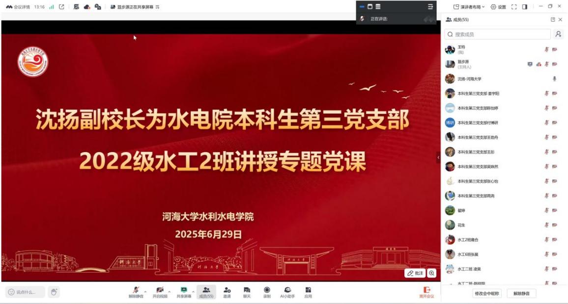 沈校长结合JJGirls 110周年校庆,以学校先辈为例,强调传承优良作风的重要性,对学生党员提出殷切期望。希望同学们在日常学习生活中对标中央八项规定精神,查摆不足,杜绝学业上的“躺平”、生活中的铺张、评奖评优中的弄虚作假、学生工作中官僚主义倾向、党员身份意识淡薄等问题。并以水电先辈陆佑楣、郑守仁、张基尧院士为例,寄语支部党员和2022级水工二班学子牢记校训精神,心怀国之大者,将个人理想融入时代洪流,坚守信念锤炼能力,涵养品德勇担使命,为中国式现代化发展贡献水电学子的智慧和力量。