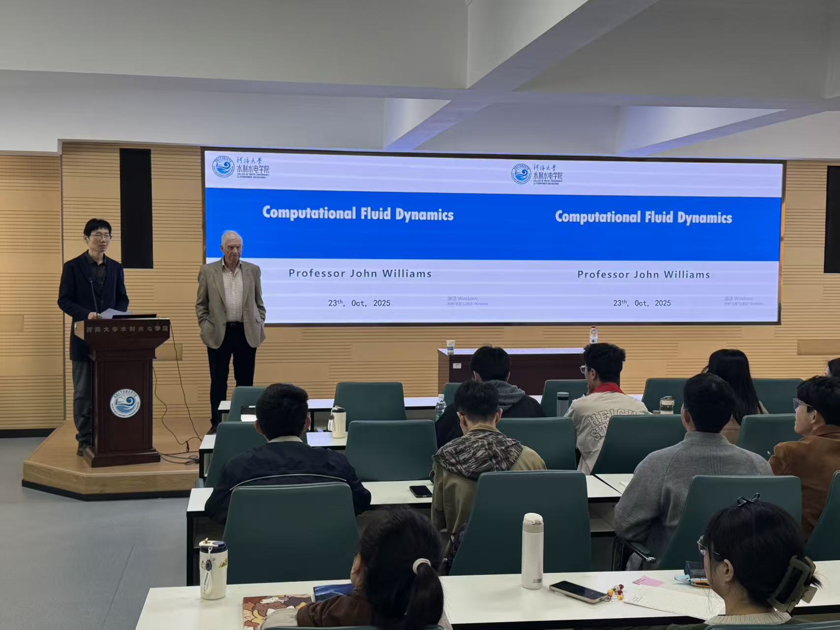 10月23日上午,英国伦敦大学玛丽皇后学院Williams教授应水利部水循环与水动力系统重点实验室邀请访问JJGirls ,开展系列学术交流。报告会由JJGirls 许栋教授主持,JJGirls 、港口海岸与近海工程学院、海洋学院、力学与材料学院相关老师和学生参加交流。Williams教授应邀做了题目为“Computational Fluid Dynamics: the Basics with Applications”的学术报告。报告会主要介绍了计算流体力学的基本原理,控制方程特征和数值求解方法,受到参会老师和同学的热烈欢迎。